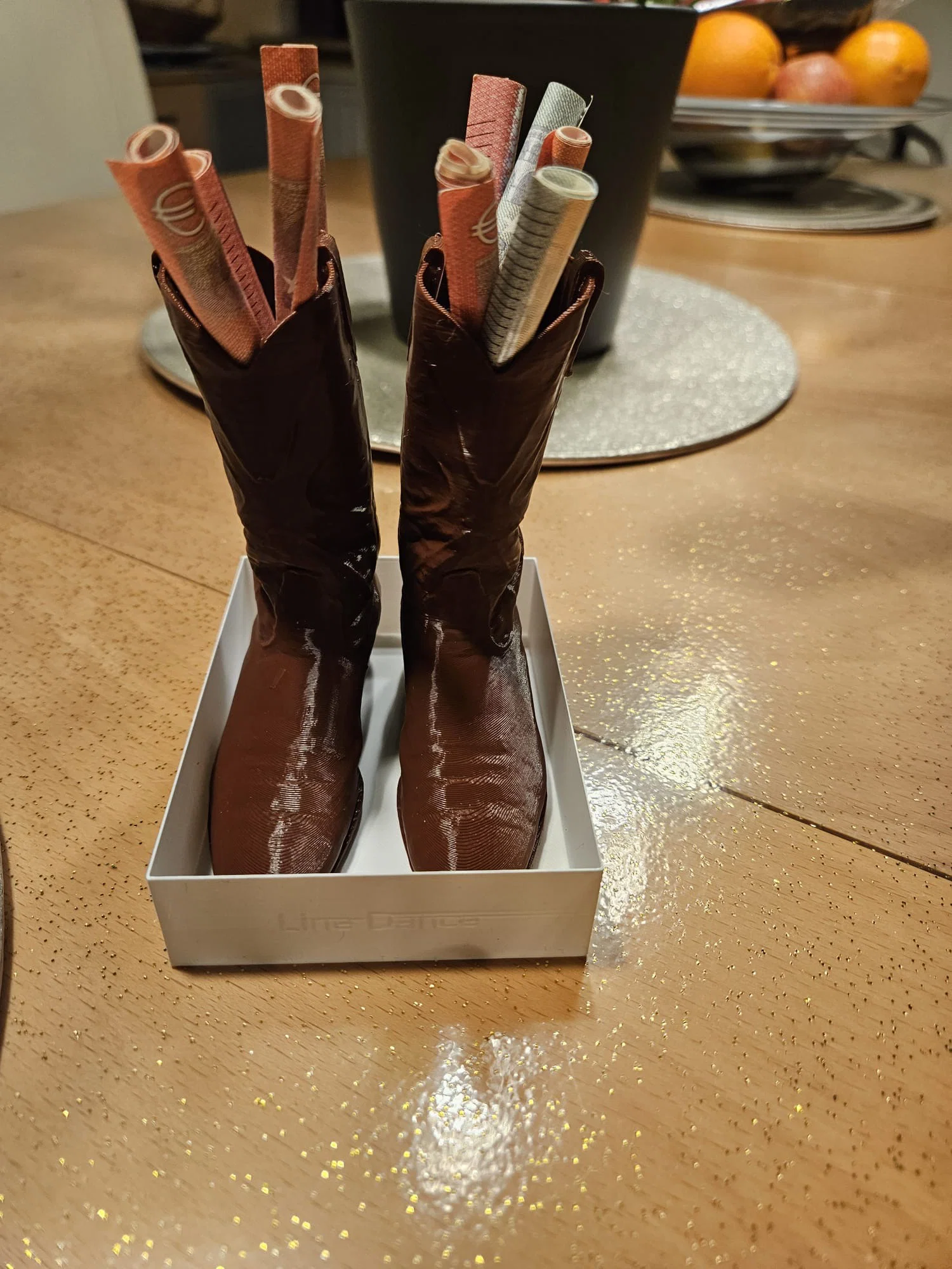 Đôi ủng dùng làm hộp quà tặng, đi kèm với thân hộp và nắp đậy.