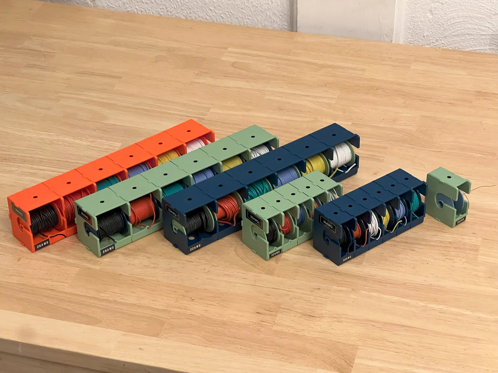 Đây là bộ khay đựng cuộn dây dạng mô-đun mà mình thiết kế cho các loại dây AWG nhỏ, nhưng nó lại tỏ ra cực kỳ tiện lợi khi dùng để giữ dây hàn chì. Mỗi cuộn đơn có thể chứa tới 10 mét dây 30AWG, còn loại đôi thì chứa được 10 mét dây 22AWG. Đối với các loại dây lớn hơn 18AWG thì không phù hợp vì chúng quá cứng, dễ bị bung ra nếu không được giữ căng. Phần lõi cuộn dây kết nối với hai bên bằng khóa ngàm dạng bajonet và có lỗ lục giác, giúp bạn dễ dàng dùng tua vít lục giác 5mm gắn vào máy khoan điện để quấn dây. Bạn cần in hai mặt cho mỗi lõi cuộn và một nắp cho mỗi chồng khay. Mình đã in trên máy Prusa MK3 và MK4 với nhựa PETG, chiều cao lớp in 0.2mm, không cần support, không cần infill. Nếu gặp vấn đề về độ ổn định khi in phần lõi đôi, mình gợi ý bạn thêm 2mm brim với khoảng cách 0mm để tăng độ bám bàn in nhé.