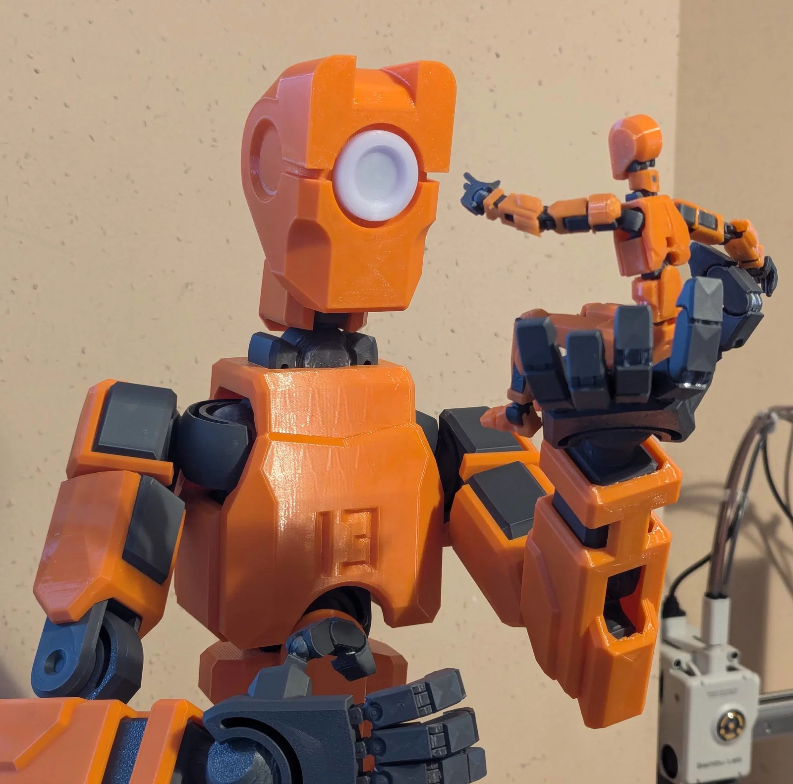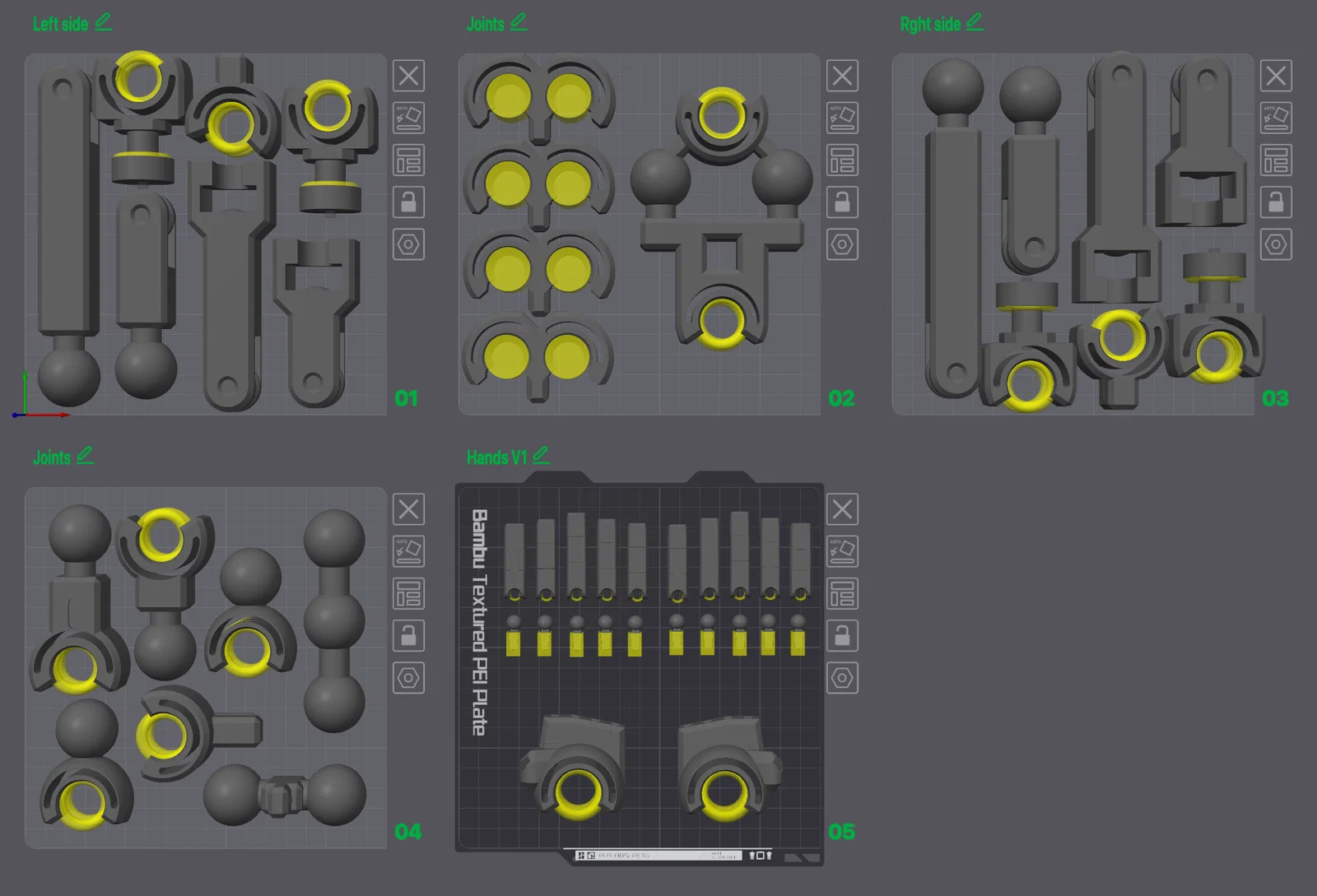 Hãy xem phiên bản mới, Dummy 13 v1.0 theo tỷ lệ - rất khuyến khích dùng bản này nếu anh em mới bắt đầu in! Đây là bộ linh kiện đầy đủ để in mô hình Dummy13 tuyệt đẹp của @soozafone ở tỷ lệ 500%. Bản remix này đã khắc phục hầu hết các vấn đề anh em thường gặp phải khi in ở kích thước này. Tôi tin là nó cũng sẽ hoạt động tốt cho các tỷ lệ từ 300% đến 700%. Đã được kiểm tra trên máy A1 Mini. Ngoài ra, nó bao gồm bàn tay được thiết kế lại hoàn toàn: các ngón tay có khớp nối linh hoạt và được in liền một khối (ráp từng phần nhỏ ở tỷ lệ này rất cực). Các khớp ngón tay và lòng bàn tay đã được tách rời. Anh em sẽ cần khoảng 0.6kg cho phần khung xương và 0.75kg nhựa cho phần giáp. Trước khi in mô hình này, tôi gợi ý anh em nên in thử mẫu bàn tay cử động được để kiểm tra thông số máy và loại nhựa. Đối với khung, hãy dùng PETG, ASA, v.v. Nếu dùng PLA, các khớp sẽ bị lỏng theo thời gian do hiện tượng biến dạng creep. Nếu anh em đã lỡ in bằng PLA rồi, hãy dùng các miếng chèn in bằng PETG hoặc ASA để khắc phục. UPD: Cập nhật file khung xương v1.1 (khớp lòng bàn tay và ngón tay trước đây bị lỏng, và đã làm lại các khớp ngón tay). UPD: v1.2 Đã thêm các miếng chèn cho Joints+. Xem đánh giá và hình in các mẫu phóng to của tôi tại: Dummy 13 Beta trên makerworld Dummy 13 V1.0 trên makerworld Dummy 13 V1.0 trên printables Mời anh em ghé xem các tác phẩm khác của tôi trên makerworld, printables, chia sẻ thành quả in của mình và chúc anh em in ấn vui vẻ!