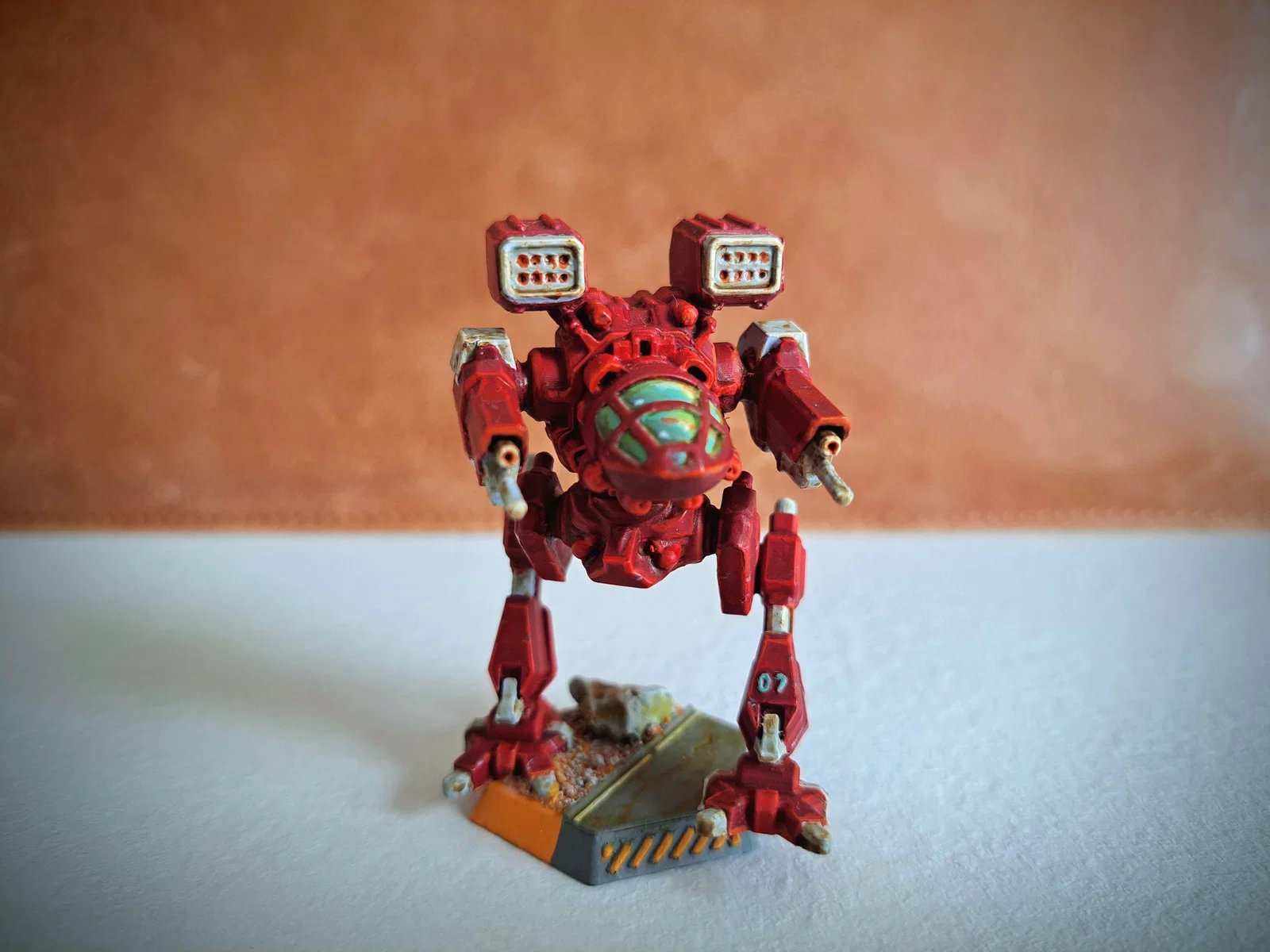 Được sơn theo màu của Draconis Combine (Sword of Light, Trung đoàn 8, Tiểu đoàn 1, Đại đội trinh sát hạng nặng số 7) bằng màu Vallejo Game Colors.
