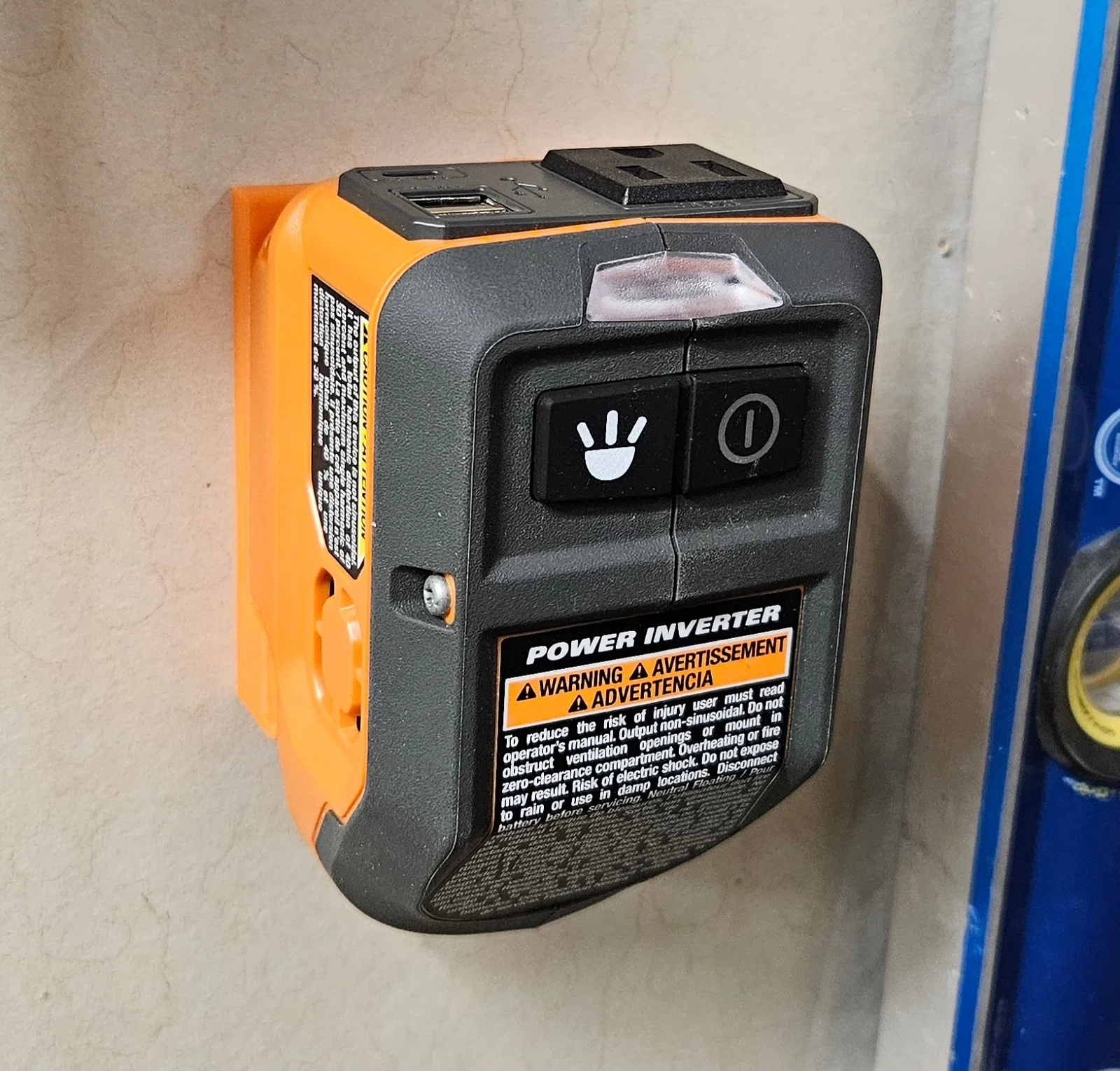 Đây là phiên bản ngược lại của đế gắn pin. Nó giúp bạn có thể treo các loại dụng cụ cầm tay lên tường. Mình thiết kế cái này đặc biệt để làm một lựa chọn gọn nhẹ giúp treo bộ biến tần (inverter) của mình.