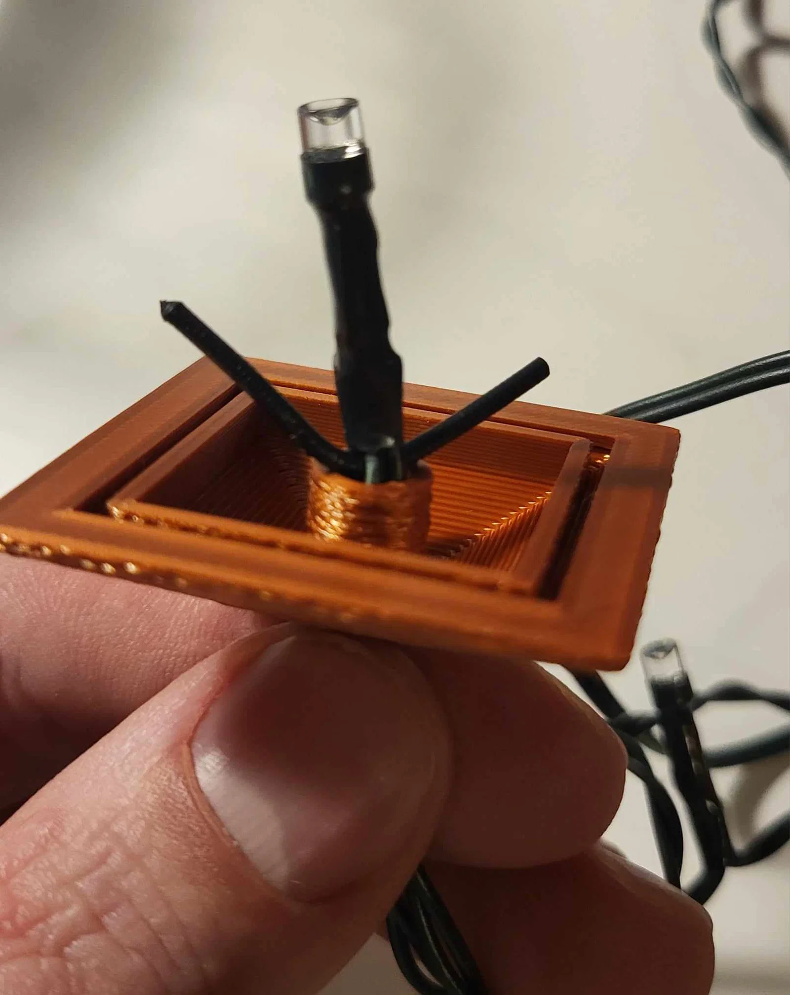 • Lắp đèn LED: Sử dụng bóng LED 5mm, cố định chắc chắn bằng một đoạn nhỏ sợi in TPU để giữ đèn ở vị trí trung tâm.