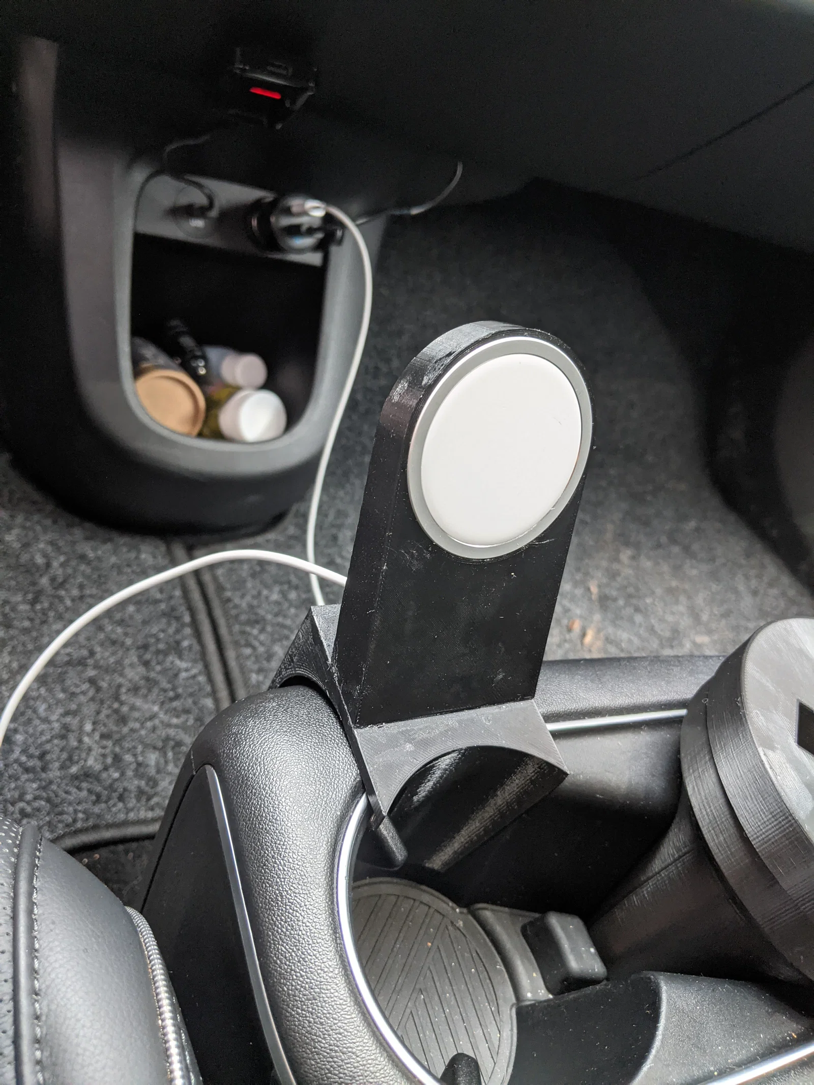 Vì sạc không dây trên xe Ioniq 5 khá tệ, mình đã thiết kế giá đỡ MagSafe đặt tại hốc để chai nước. Thiết kế gồm hai phần tách rời để in dễ dàng, sau đó dán lại bằng keo. Phù hợp cho củ sạc Anker PowerDrive Speed+ 2 và sạc MagSafe của Apple.