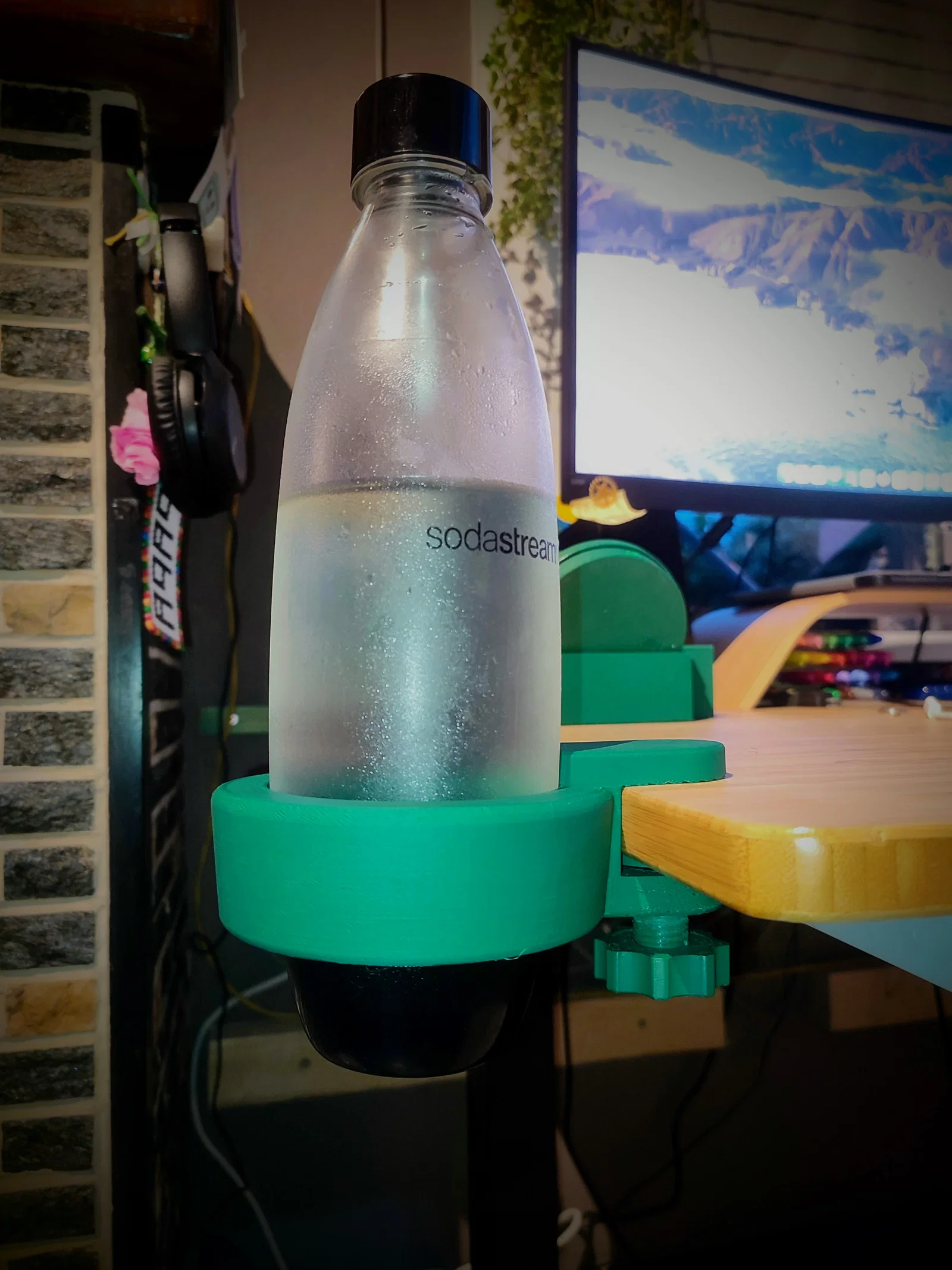 Chai SodaStream của mình cứ hay để trên bàn hoặc để dưới đất cạnh bên, làm mình cứ quơ tay trúng hoài. Thế nên mình đã tìm ra giải pháp hoàn hảo là kẹp nó vào cạnh bàn luôn. Giờ đây, chai nước vẫn nằm trong tầm tay, không hề chiếm diện tích trên mặt bàn mà mình cũng chẳng lo vô tình đụng trúng nữa.