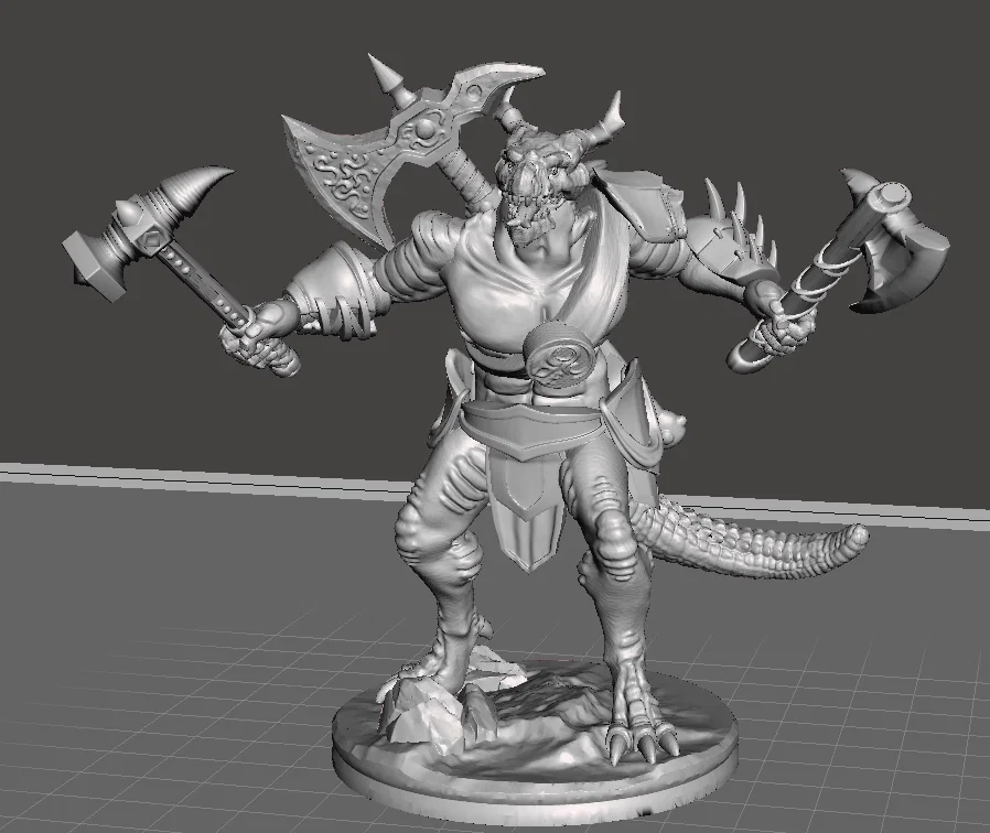 Chi tiết của mô hình được điêu khắc rất tỉ mỉ, từ lớp vảy rồng trên cơ thể cho đến những món trang bị như chiếc búa chiến, rìu cầm tay và một chiếc rìu lớn đeo sau lưng. Nhân vật được thể hiện trong tư thế đứng vững chãi trên đế đá, tạo cảm giác mạnh mẽ và không sợ hãi trước bất kỳ kẻ thù nào. Đây thực sự là một tác phẩm tuyệt vời dành cho những ai đam mê thể loại kỳ ảo hoặc các game board game chiến thuật cần những nhân vật có tạo hình cá tính.