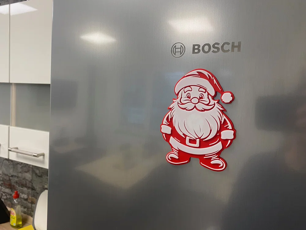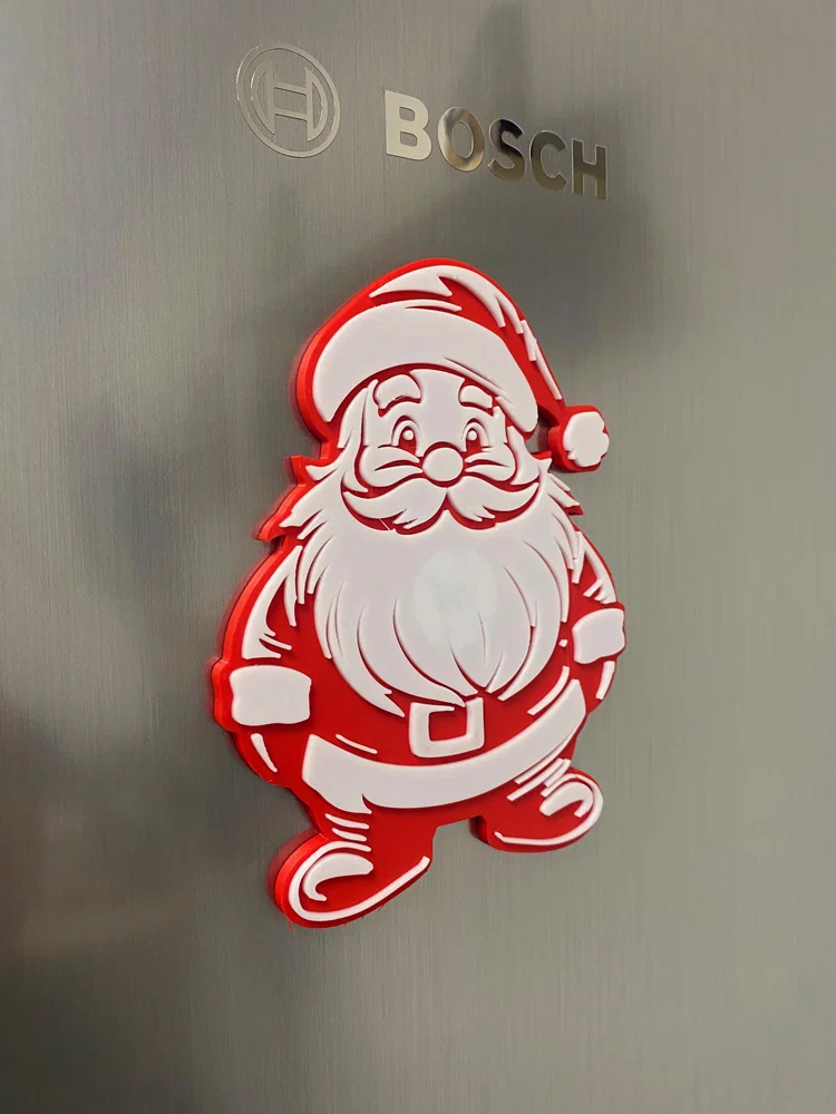 Đây là phiên bản cải tiến từ mẫu trang trí tường ông già Noel của 29flos. Mẫu này đã được làm dày hơn (5mm) và thiết kế thêm một lỗ tròn ở giữa để bạn có thể gắn nam châm với kích thước tối đa 20x20x3mm. Hình ảnh minh họa cho thấy sản phẩm đang được gắn trên tủ lạnh BOSCH bằng kim loại.