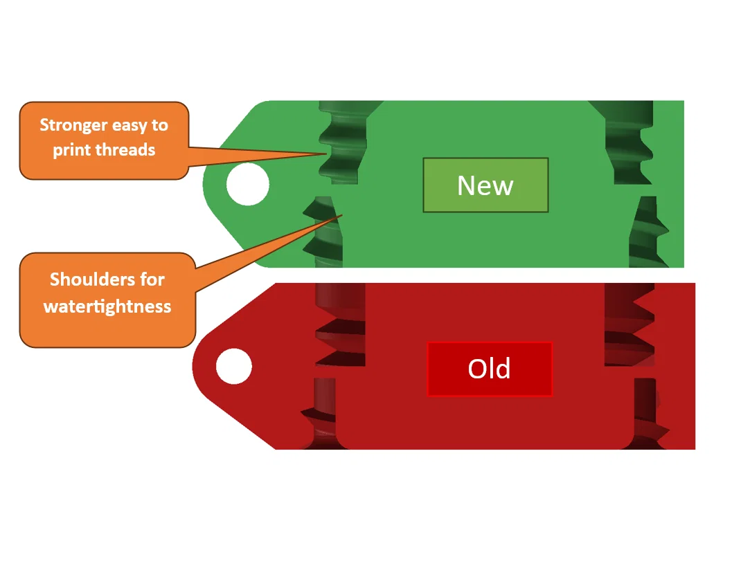 Tôi đã kiểm tra kỹ để đảm bảo nó không bị rò rỉ khi in bằng vật liệu PETG hoặc ABS+ với độ dày lớp in 0.2mm, miễn là bạn vặn nắp thật chặt. Tuy nhiên, hãy lưu ý rằng PETG có thể khó xử lý hơn vì nó dễ tạo ra sợi nhựa thừa và các cục nhựa nhỏ. Vì vậy, bạn nên làm sạch phần ren và bên trong nắp cẩn thận. Ngoài ra, PETG cũng khó vặn ra vào hơn một chút do nó "dính" hơn ABS+ và có độ ma sát cao hơn.