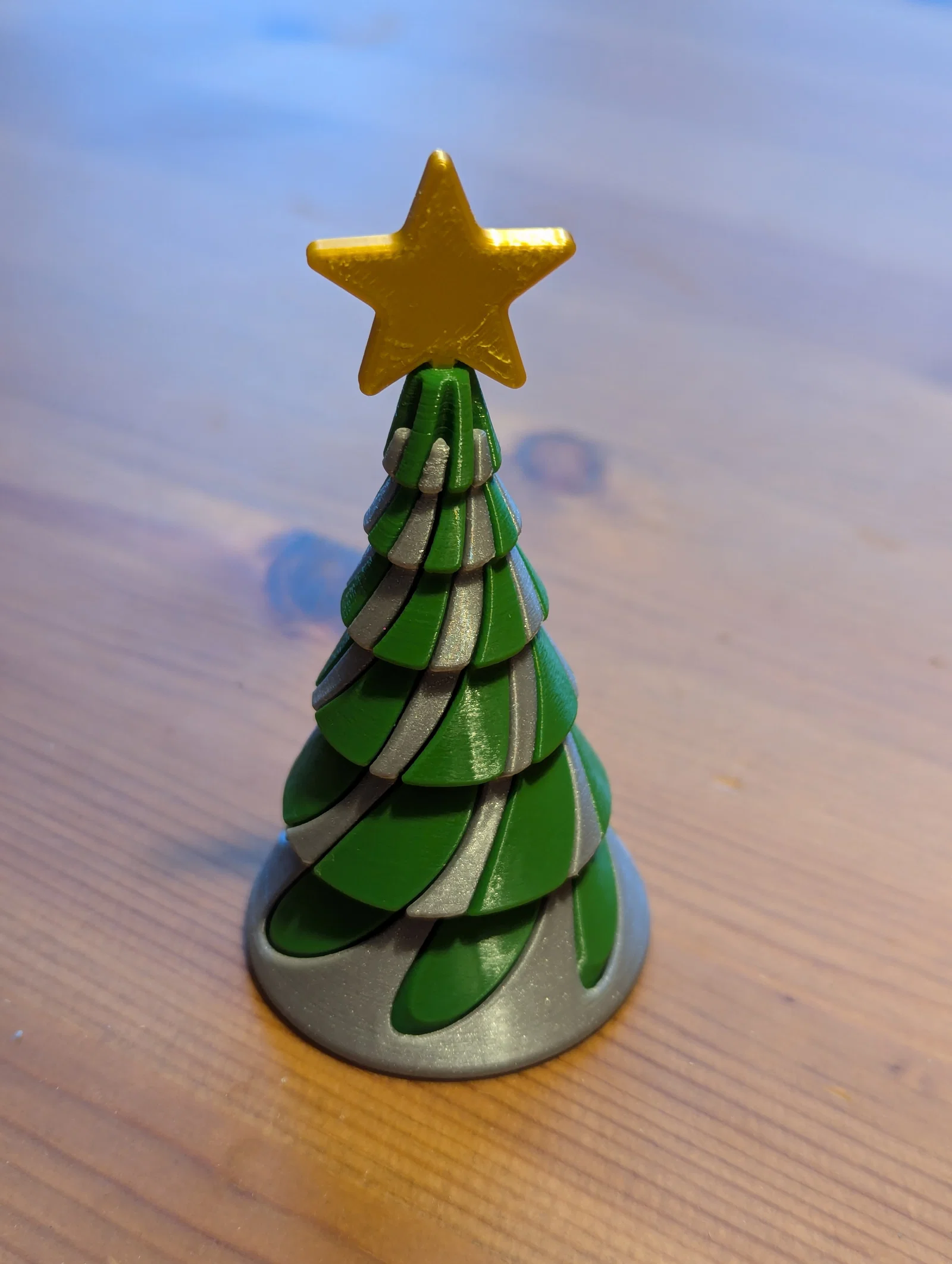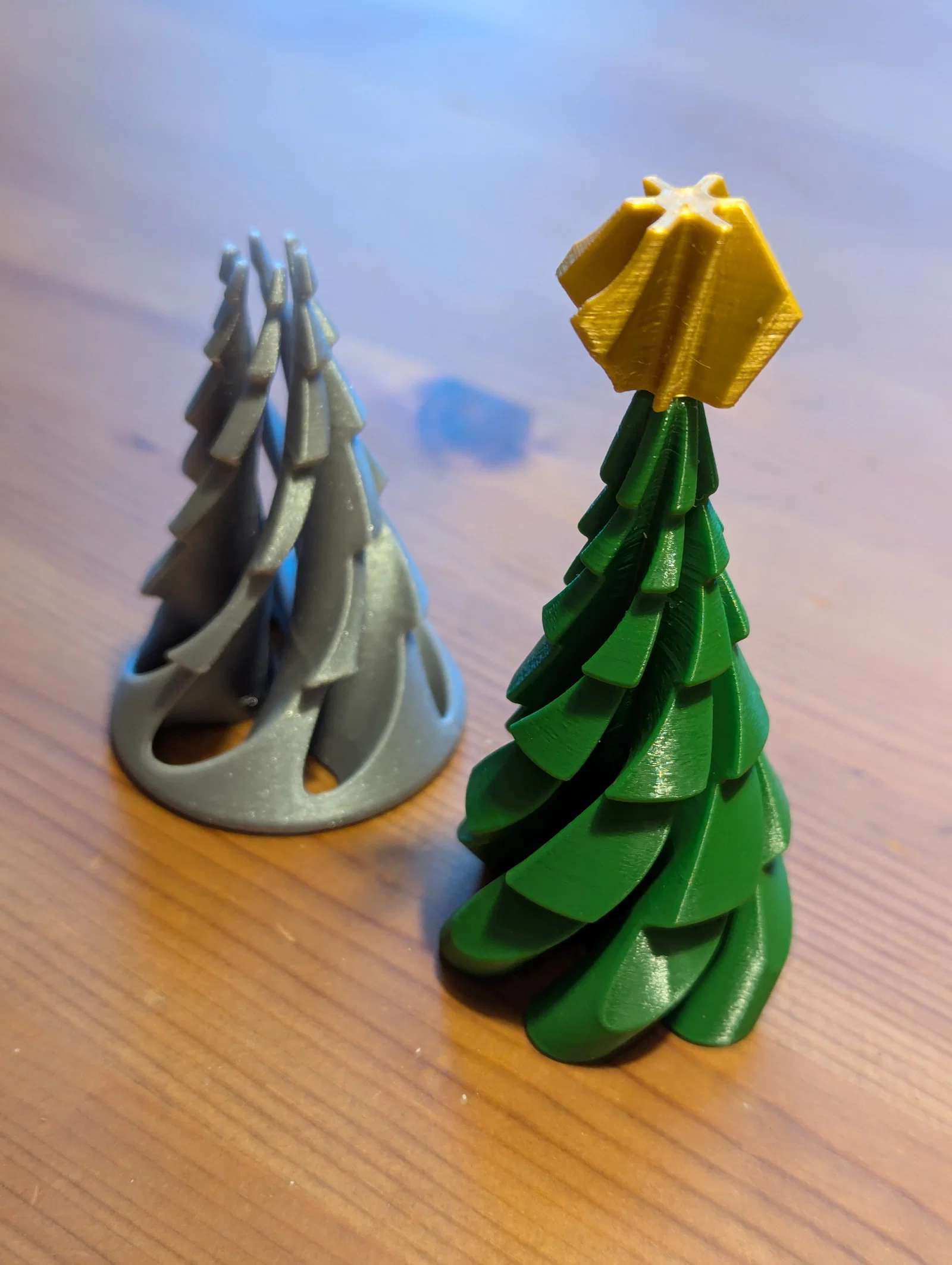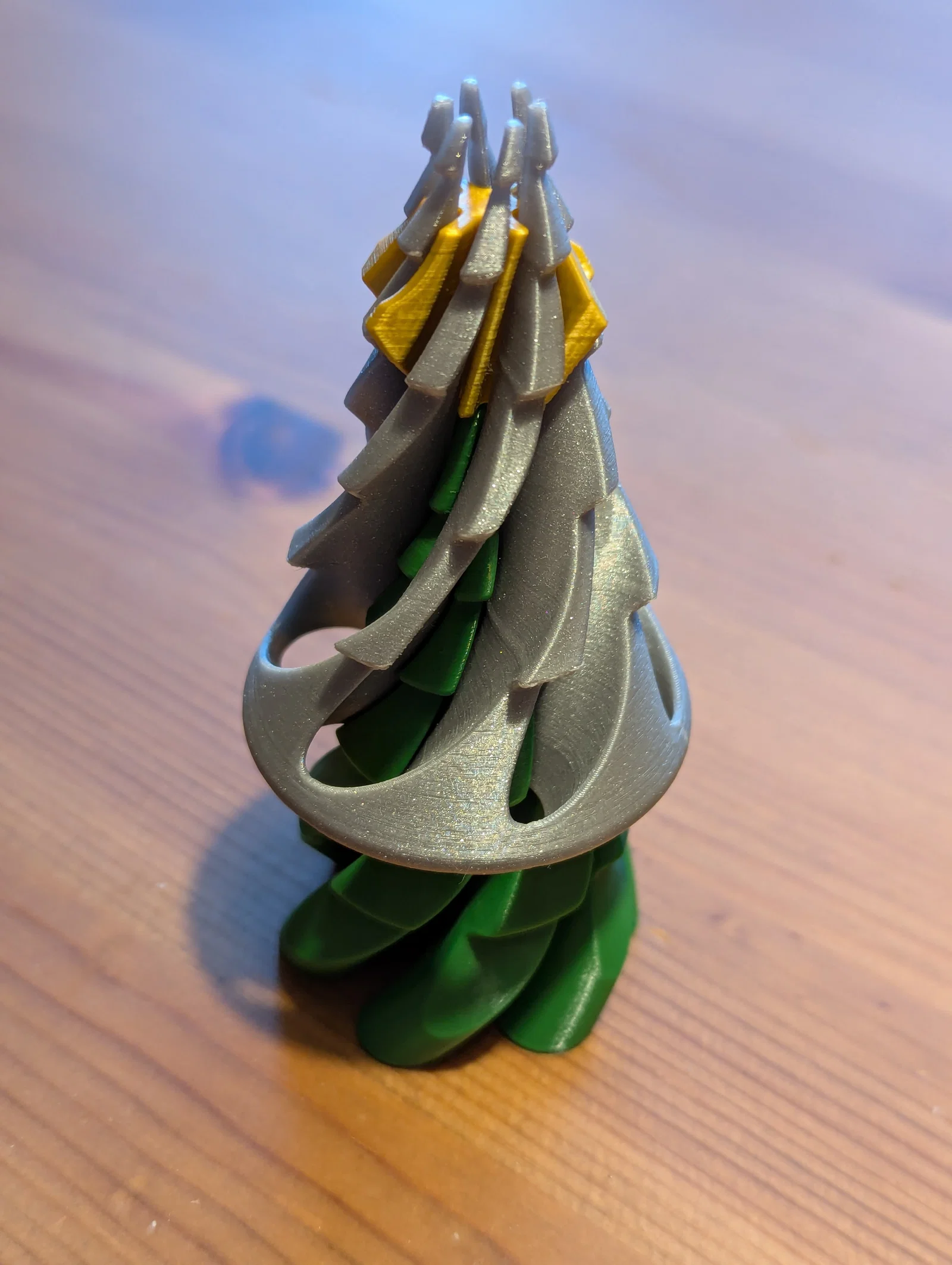 Cây thông của tôi được in bằng nhựa Fillamentum PLA Extrafill "Green Grass", Prusament PLA Galaxy Silver và add:north E-PLA màu vàng (cho đỉnh lục giác 3D) hoặc Polymaker PolyLite PLA Silk Gold (cho đỉnh lục giác cũ và đỉnh ngôi sao). Tôi sử dụng đầu in 0.4 mm, độ cao lớp in 0.1 mm (0.2 mm cũng ổn) và mật độ infill là 50% rectilinear (để tăng thêm độ đầm cho mô hình). Các chi tiết nên được in theo đúng hướng đã thiết lập sẵn trong file.