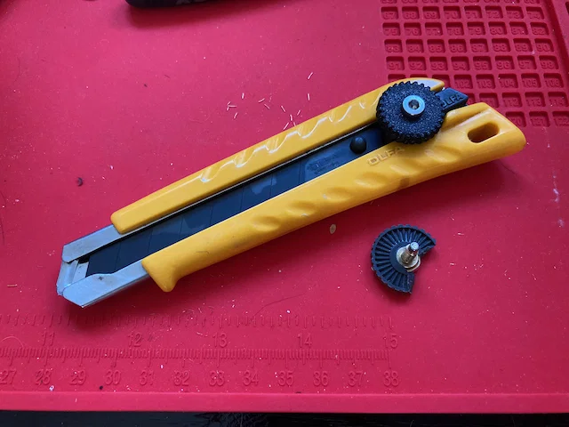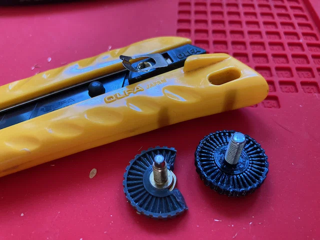 Như trong hình ảnh minh họa, núm vặn trên dao rọc giấy OLFA model L-1 của mình bị gãy. Thay vì bỏ đi, mình quyết định tự in linh kiện thay thế. Món đồ này thú vị hơn vẻ ngoài của nó, vì nó không chỉ giúp chỉnh độ sâu lưỡi dao mà còn có cảm giác khớp bánh cóc (ratcheting) khi xoay. Mình đã không nhận ra tính năng này cho đến khi phải tự thiết kế và in nó. Một chi tiết thiết kế thông minh khác của OLFA là cách họ nhúng con vít bằng đồng vào núm vặn, trông như thể nó được đúc sẵn tại chỗ! Để đơn giản hóa, mình chọn cách không nhúng con vít cũ vào núm in mới.