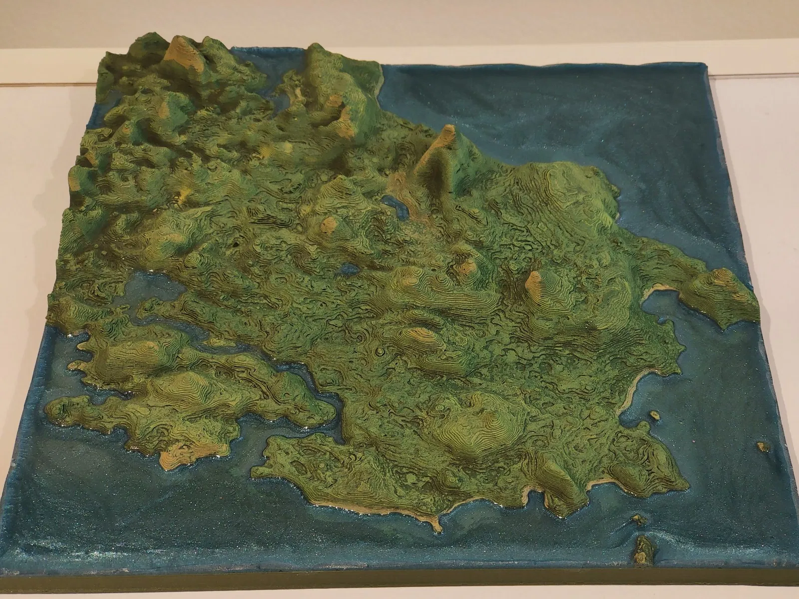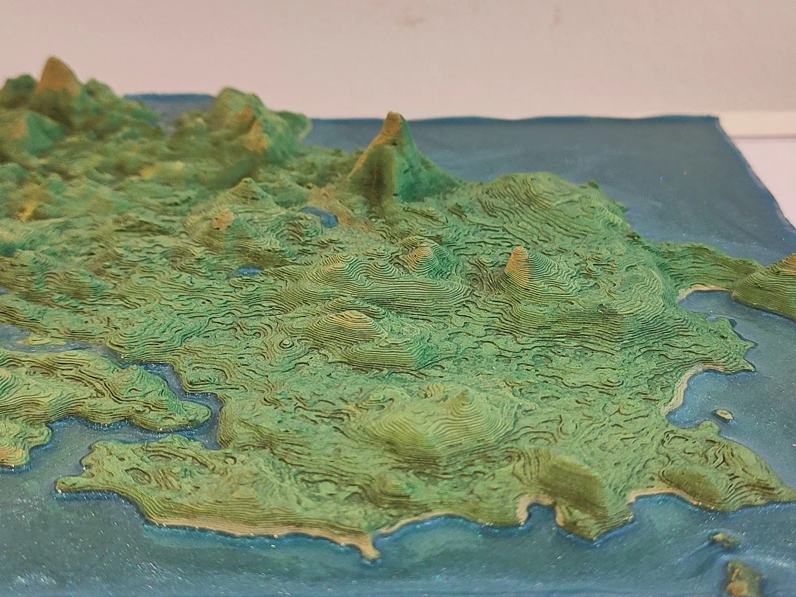 Bản đồ địa hình của Victoria, BC. Chiều cao Z được tỷ lệ 5x để làm nổi bật các ngọn đồi hơn. Biển là phẳng. Chiếu được cố định bằng cách thay đổi tỷ lệ trục X một chút.