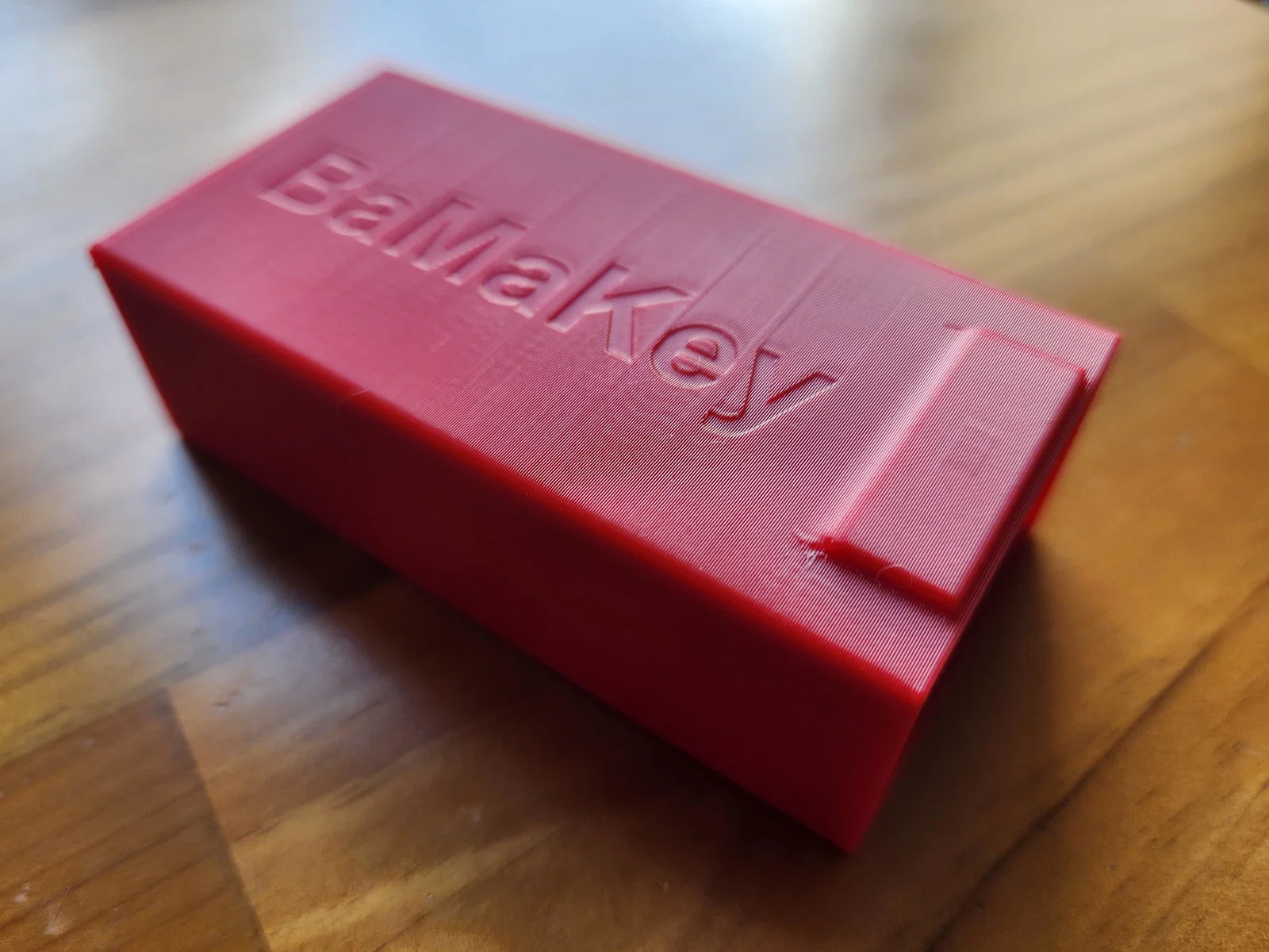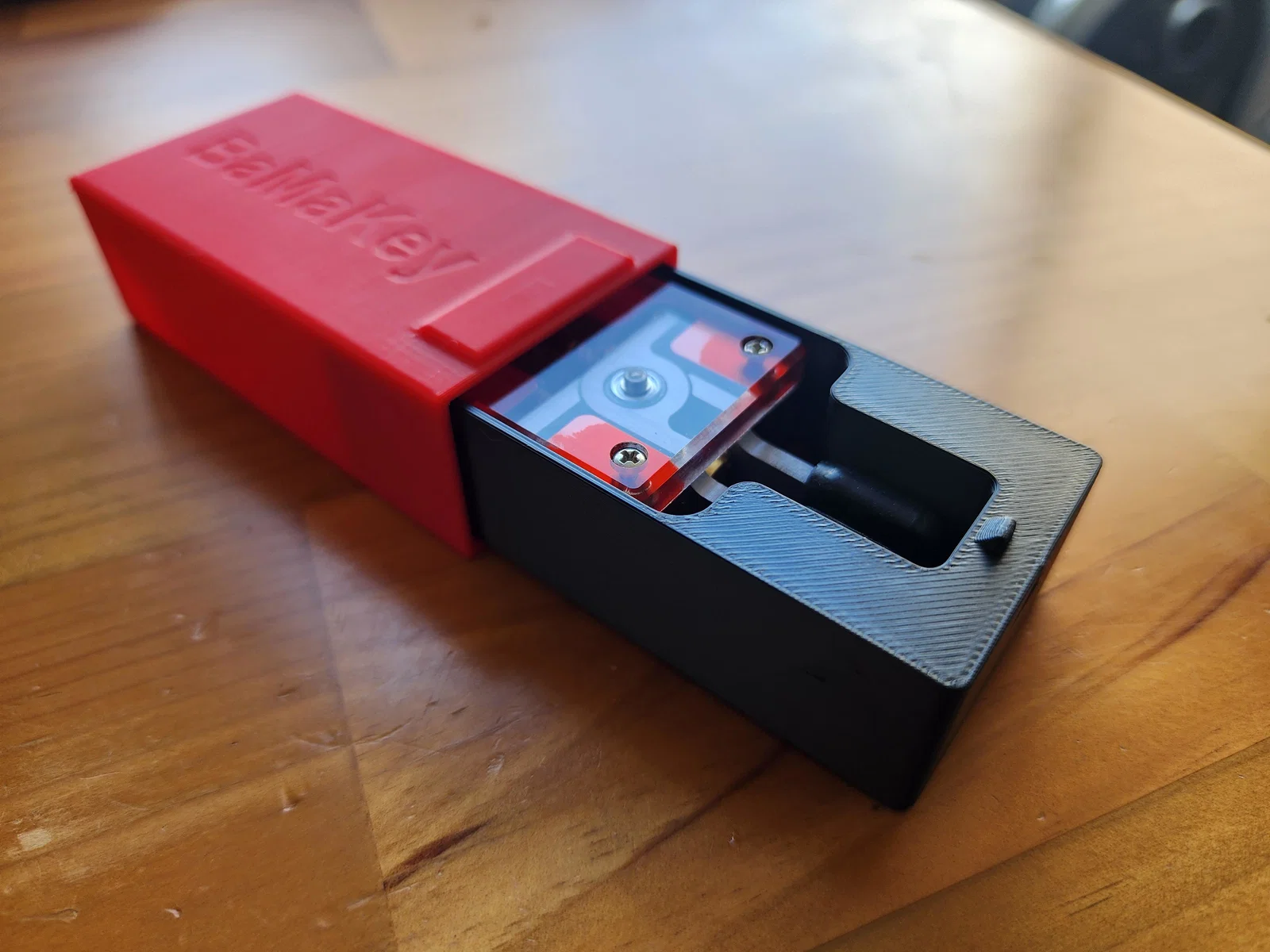 Đây là một chiếc đế giữ/bảo vệ nhỏ gọn cho chiếc BaMaKey TP-iii (phiên bản thứ hai) từ BaMaTech. Cách sử dụng rất đơn giản: phần đế chính trượt nhẹ nhàng vào vỏ ngoài, giống như hộp quẹt vậy. Thiết kế có một rãnh lõm và lẫy cài để giữ cố định khi đóng, hoạt động rất hiệu quả. Ở đầu còn lại có một lỗ khoét giúp bạn đẩy phần lõi ra dễ dàng.