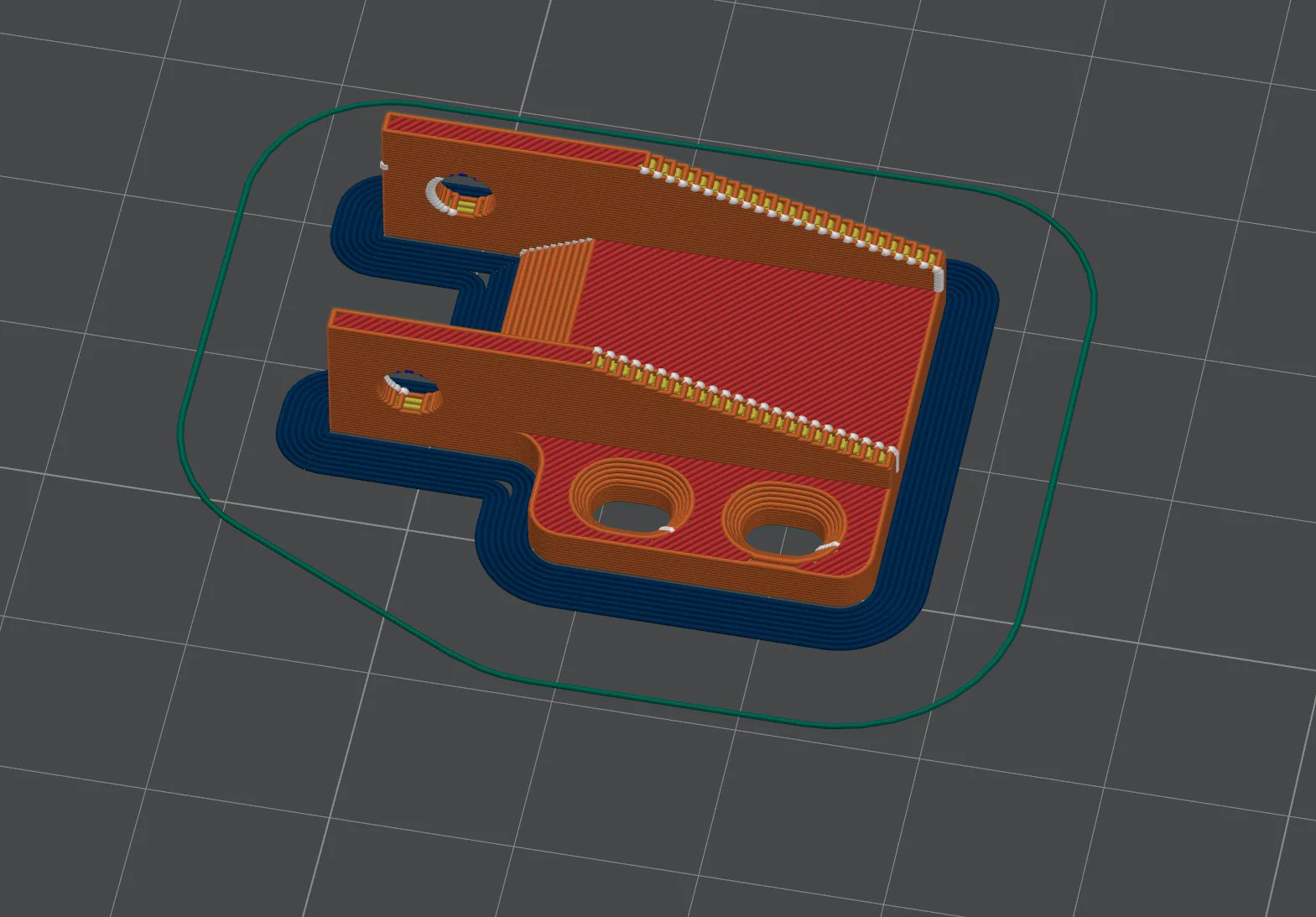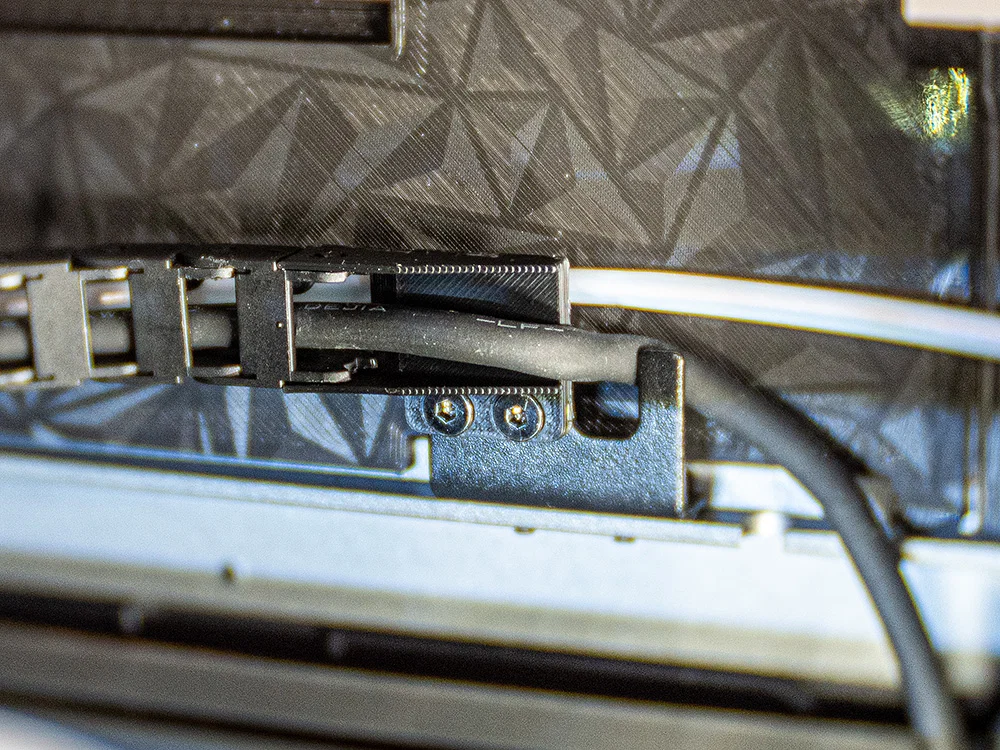 Cáp xích (energy chain) trên máy in Creality K1 nằm giữa đầu in và khung máy. Khi in ở vùng phía sau bên trái bàn in, sợi cáp này thường bị gập lại mạnh và suýt kẹt khi đầu in ép nó vào khung. Bằng cách nâng điểm cố định trên khung của sợi cáp, chúng ta có thể ngăn chặn vấn đề này. Thiết kế này giúp nâng điểm bắt đầu của sợi cáp lên khoảng 10 mm. Bạn chỉ cần tháo mắt xích đầu tiên từ các mắt xích còn lại, vặn hai con ốc cố định ra là có thể thay thế dễ dàng bằng phiên bản nâng cao này.