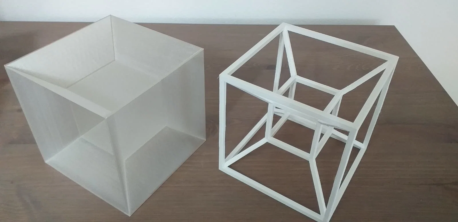 Khám phá hình chiếu của khối siêu lập phương 4D trong không gian ba chiều của chúng ta. Một món đồ trang trí độc đáo gợi nhớ đến cách Carl Sagan giải thích về chiều không gian thứ tư, rất thích hợp để in với các loại nhựa PLA trong suốt.