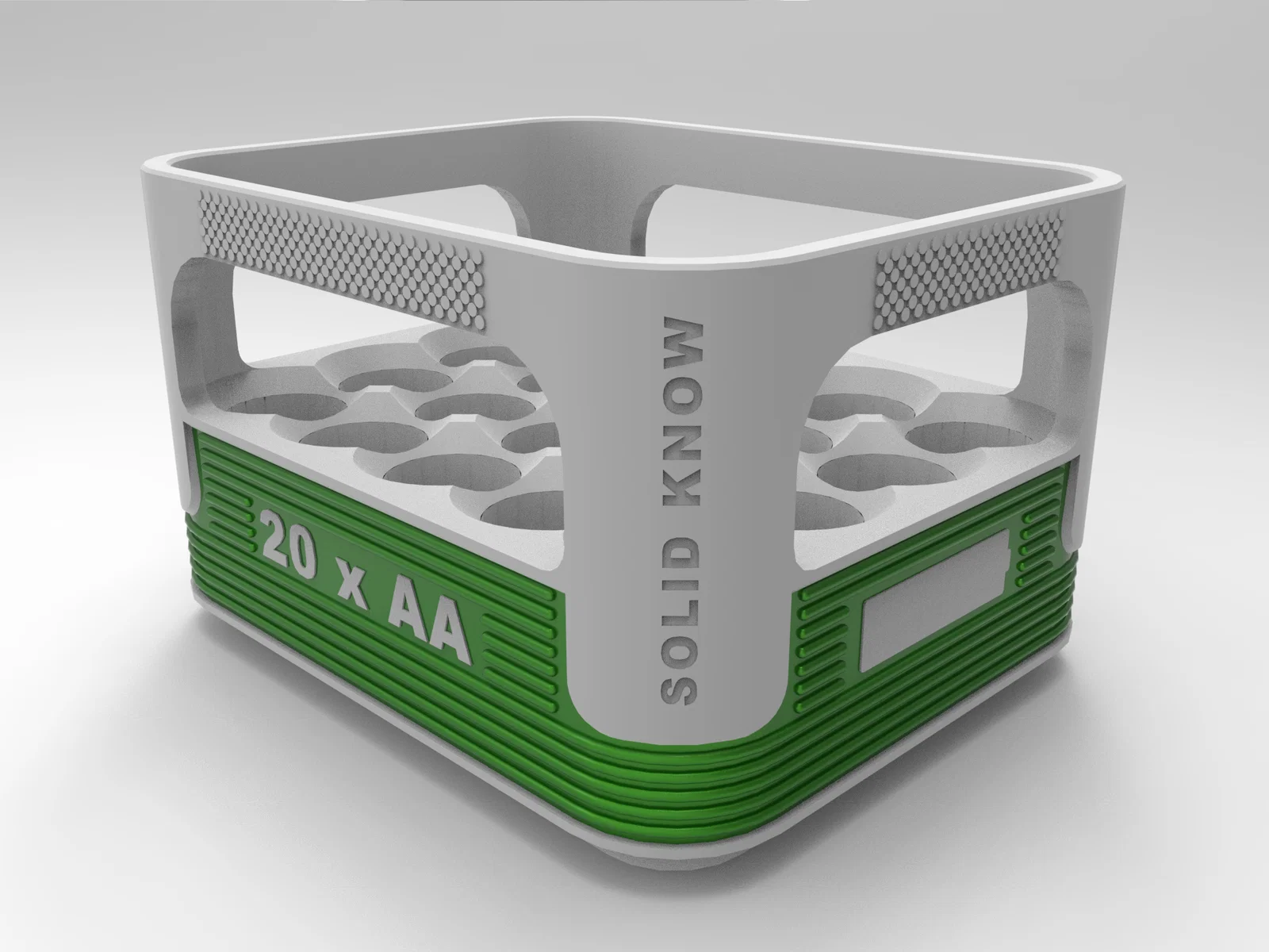 Hộp đựng pin AA được thiết kế sáng tạo theo hình dáng thùng bia Veltins. Sản phẩm có khả năng xếp chồng tiện lợi, gồm nhiều phiên bản kích thước và dễ dàng in ấn với máy in 3D dùng nhựa PLA.