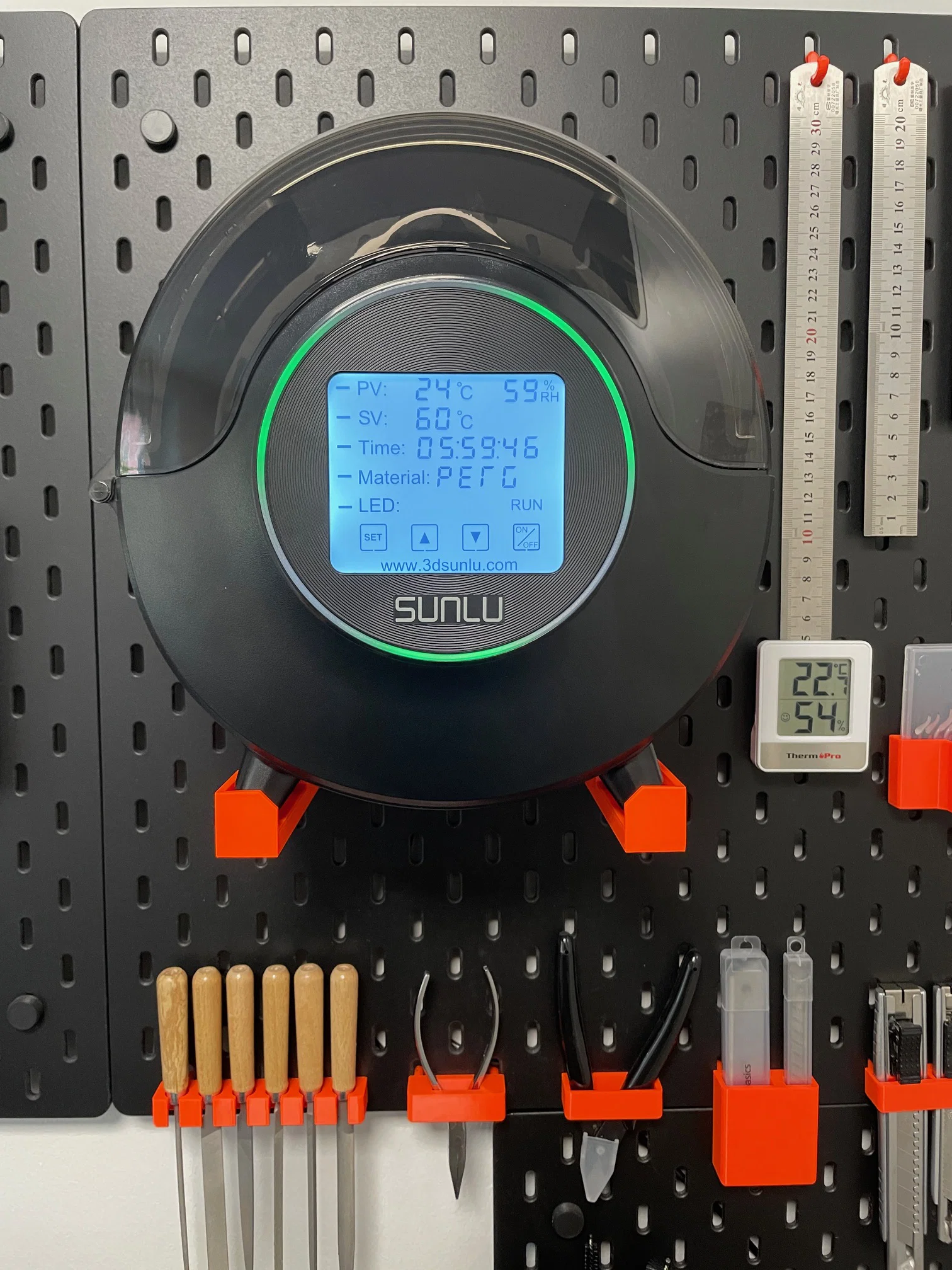 Ngàm giữ Sunlu S2 cực kỳ dễ in, giúp treo máy sấy sợi nhựa lên bảng lỗ Ikea Skadis một cách gọn gàng. Thiết kế đi kèm hệ thống T-nut chắc chắn, có đệm chống va đập để bảo vệ máy khi sử dụng màn hình cảm ứng. Khuyến khích in bằng nhựa PETG.