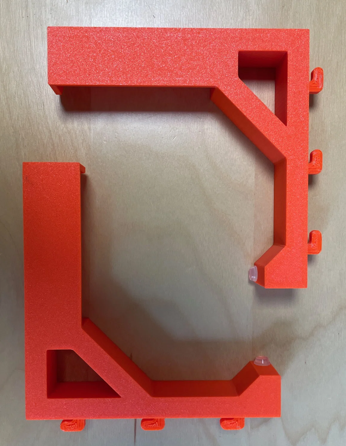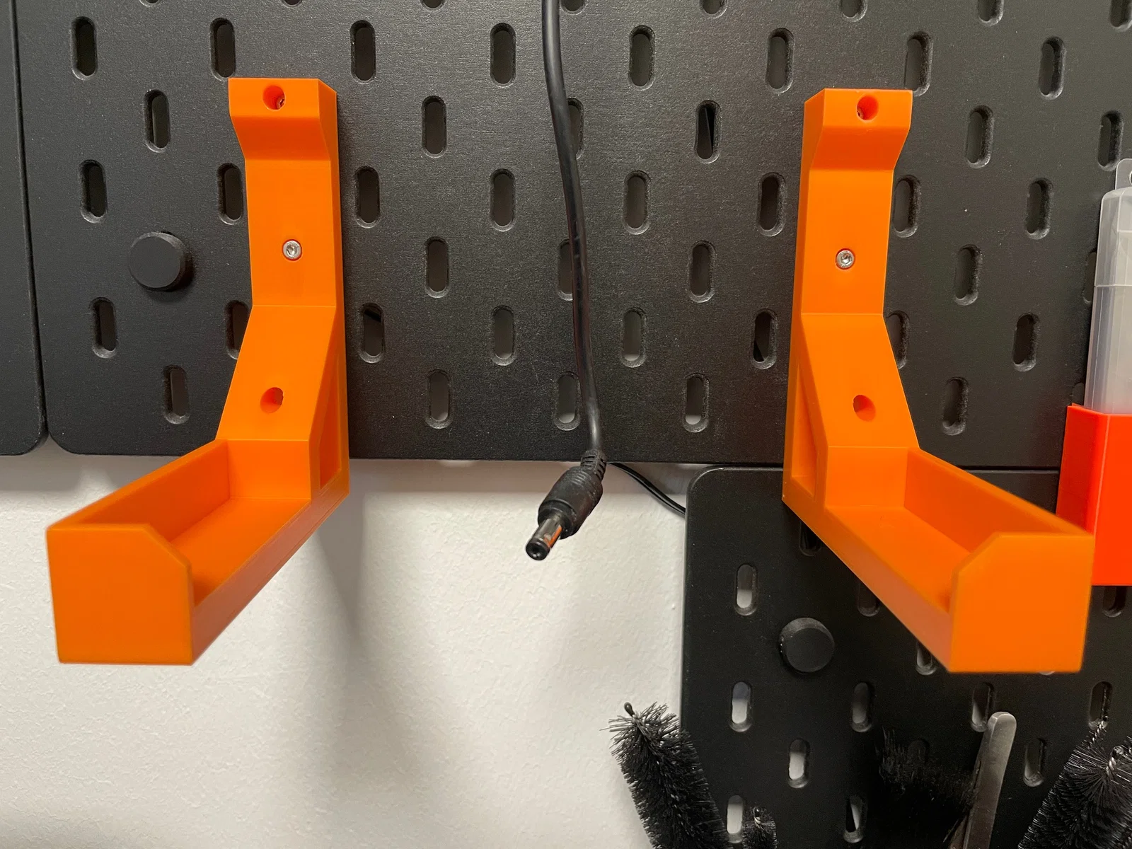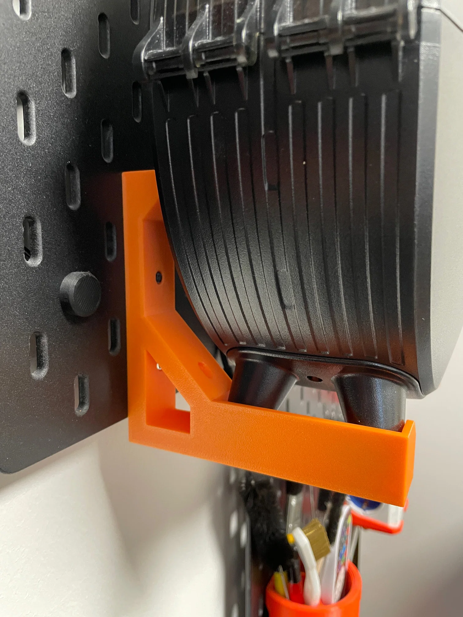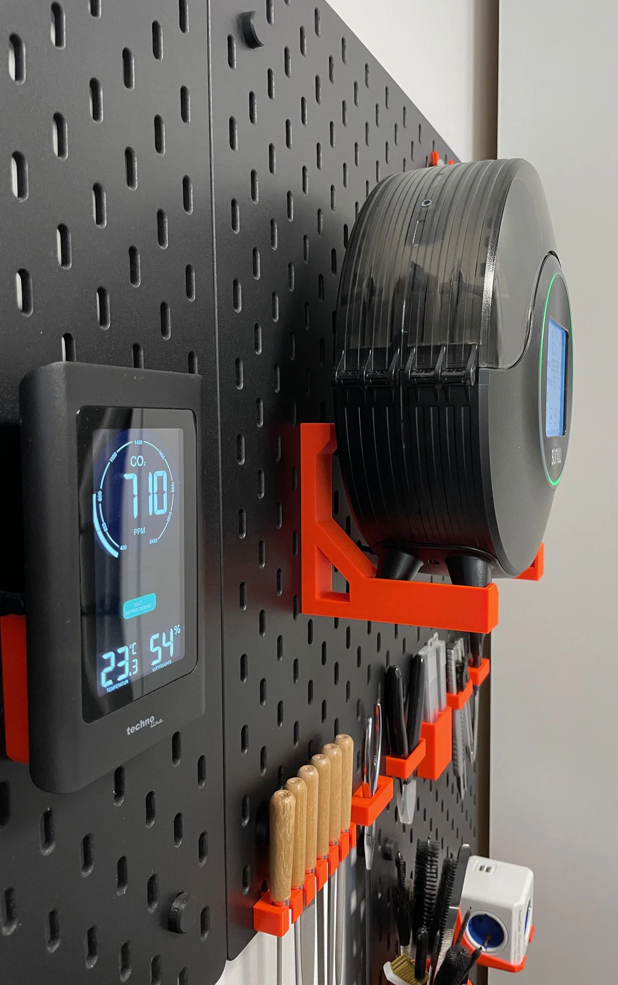 Đã bổ sung thêm ngàm giữ Sunlu S2 cho hệ thống T-nut (_xem trao đổi với “KeenEdge”). (Phần T-nut là bản remix từ thiết kế của “6d6178” và “ORM”). - Khuyến nghị: in bằng nhựa PETG. Hãy dùng support cho các móc treo. Tôi có dán thêm 2 miếng đệm cao su tự dính để khi mình thao tác trên màn hình cảm ứng, máy sấy không bị va đập vào phần ngàm cứng. Đối với việc đi dây nguồn, tôi đã khoan rộng thêm một lỗ trên bảng Skadis. Nếu anh em không muốn khoan lỗ, có thể dùng thử các kẹp cáp (cable clips) của tôi tại đây: