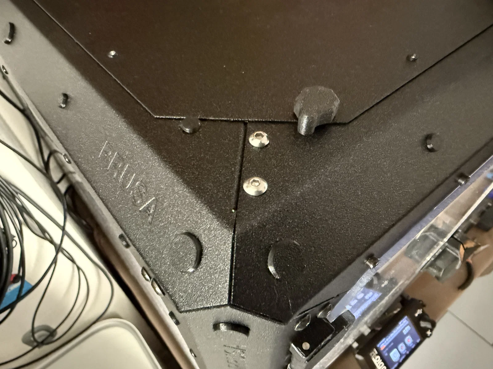 1. Tháo hai ốc M4x5r (màu đen nguyên bản) nằm ở phía trên của thùng máy Prusa.