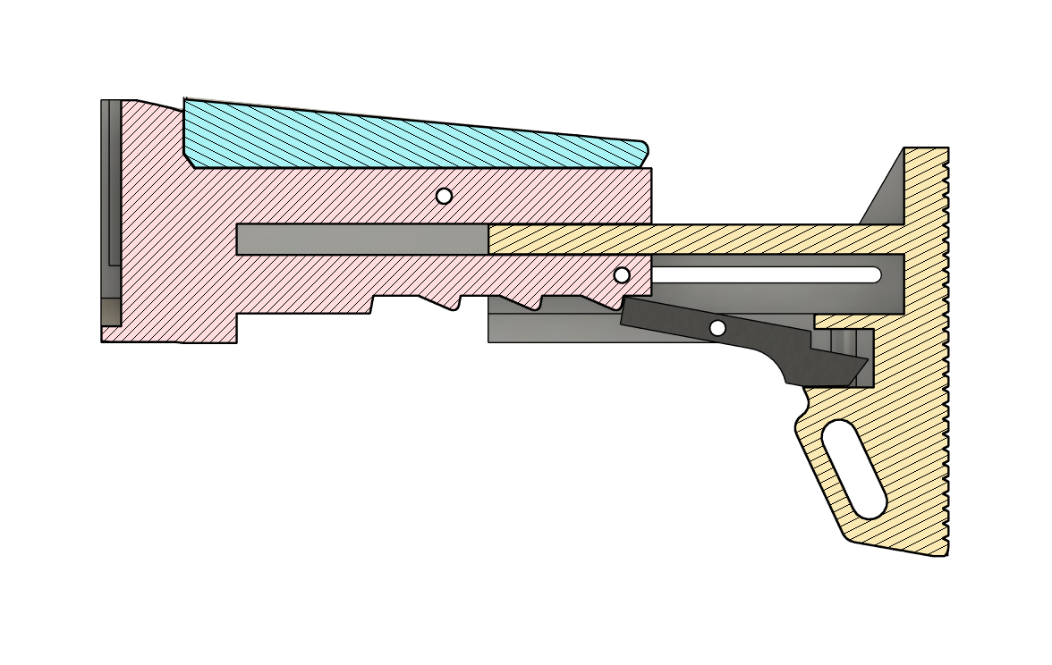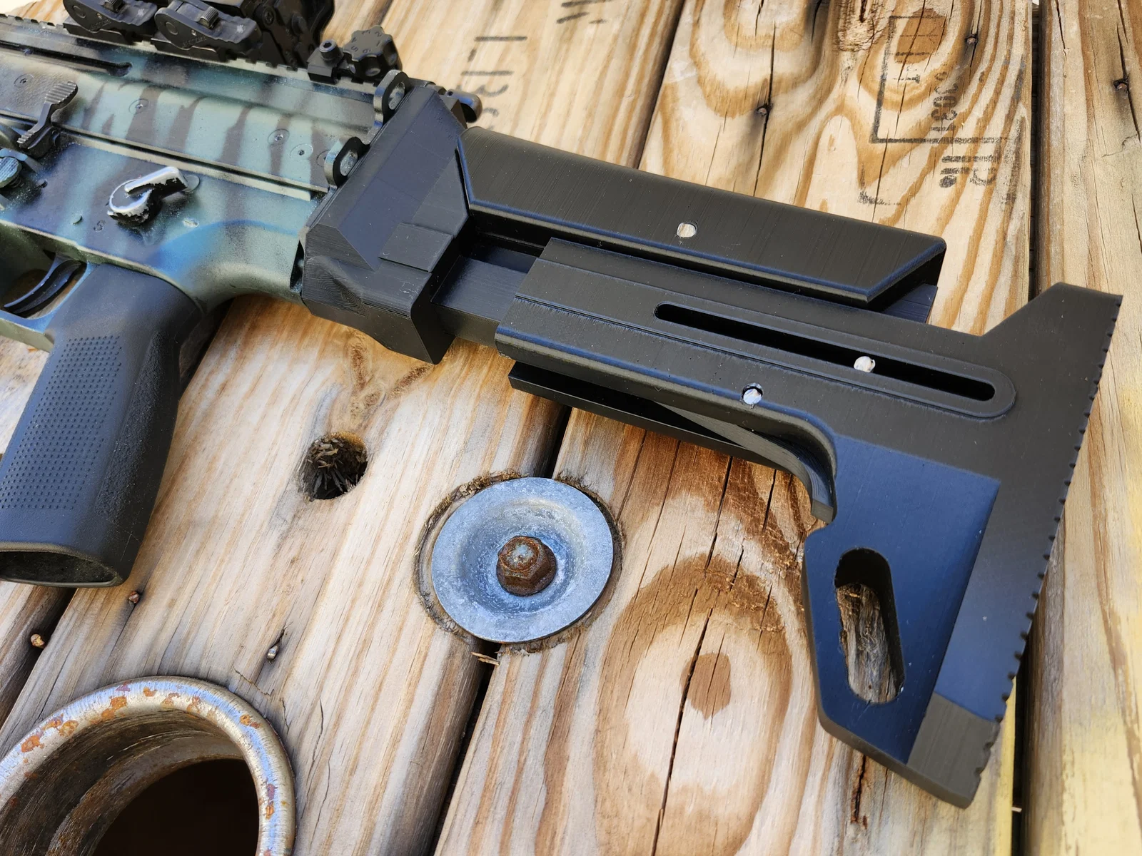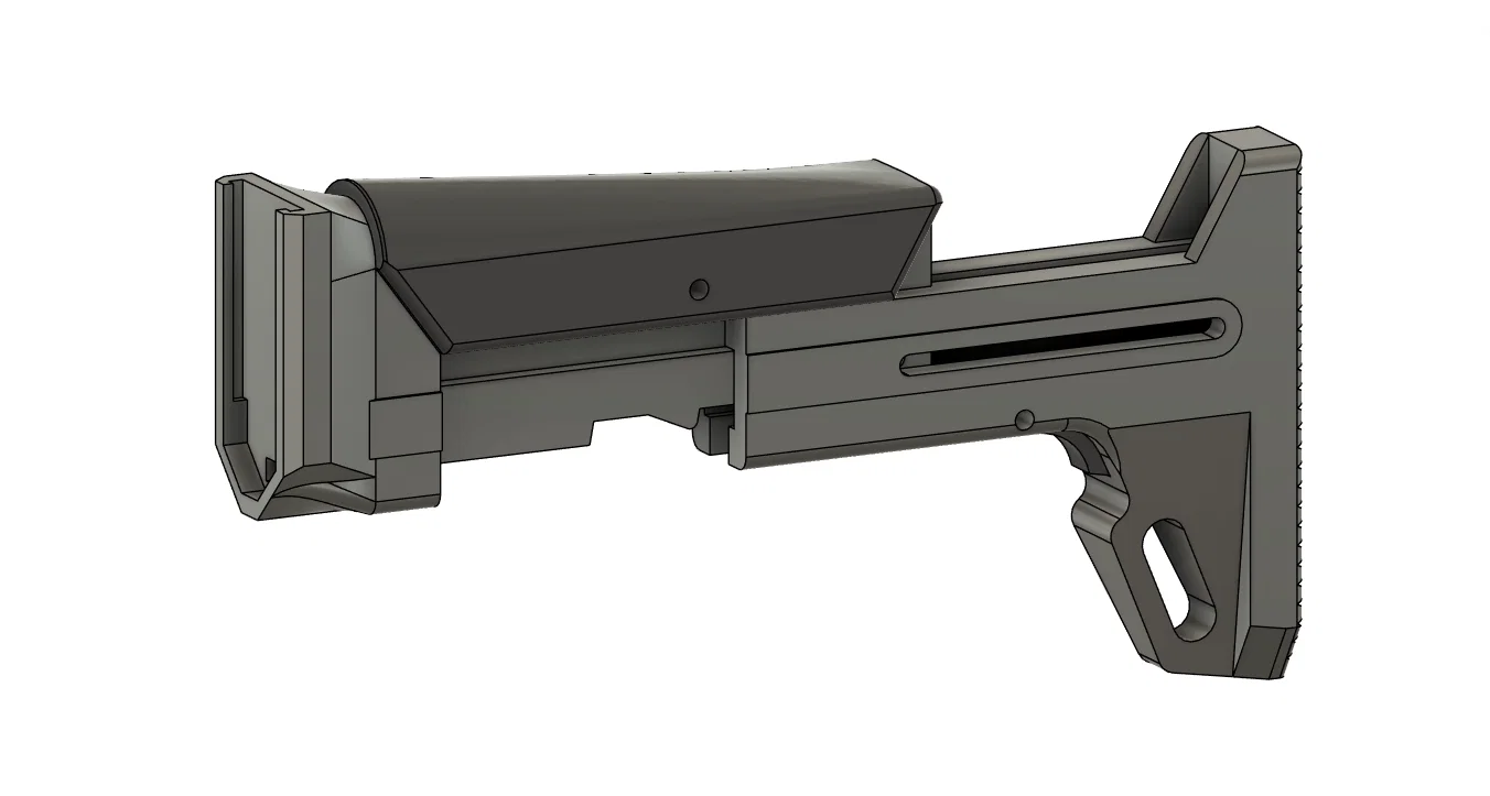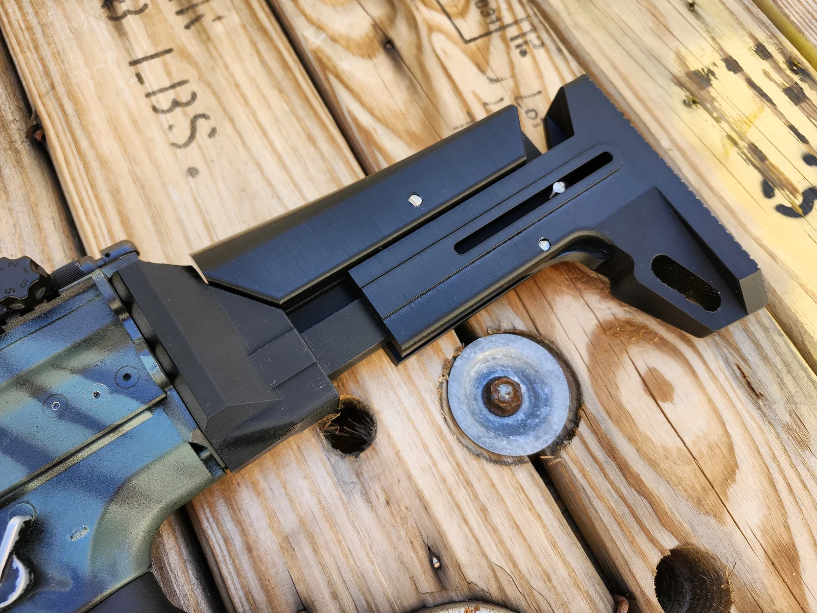 Mình muốn lắp một cái báng súng kiểu ACR cho khẩu SCAR của mình nhưng lại không muốn tốn 40 đô la để mua, nên mình đã tự thiết kế cái này. Báng súng có 4 nấc điều chỉnh độ dài.