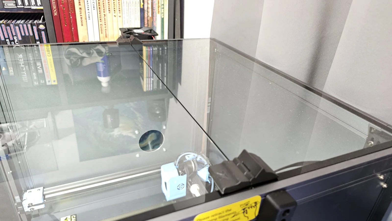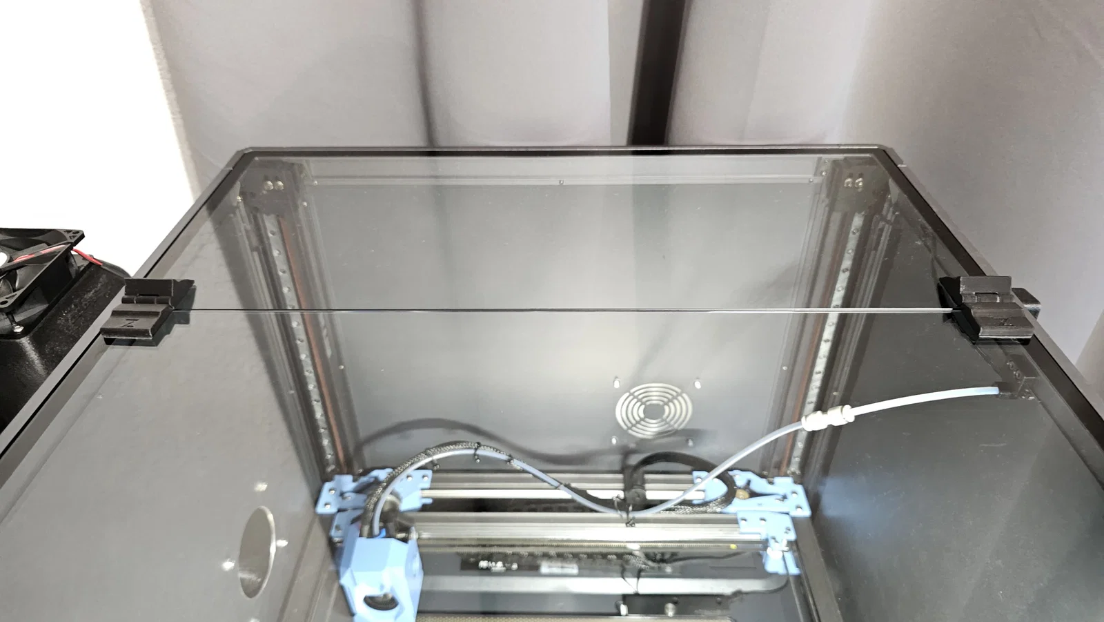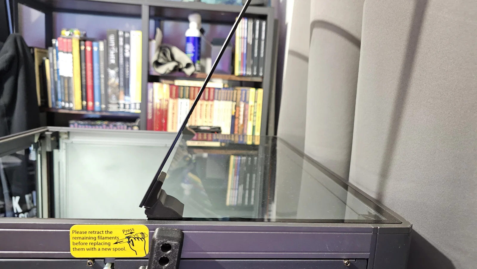 Khung máy Sovol SV08 đi kèm với 2 tấm kính ở phần trên. Thông thường, bạn phải tháo 1 hoặc cả 2 tấm kính này ra và đặt sang một bên, đồng thời mở cửa trước khi in PLA để đảm bảo máy được làm mát đầy đủ.