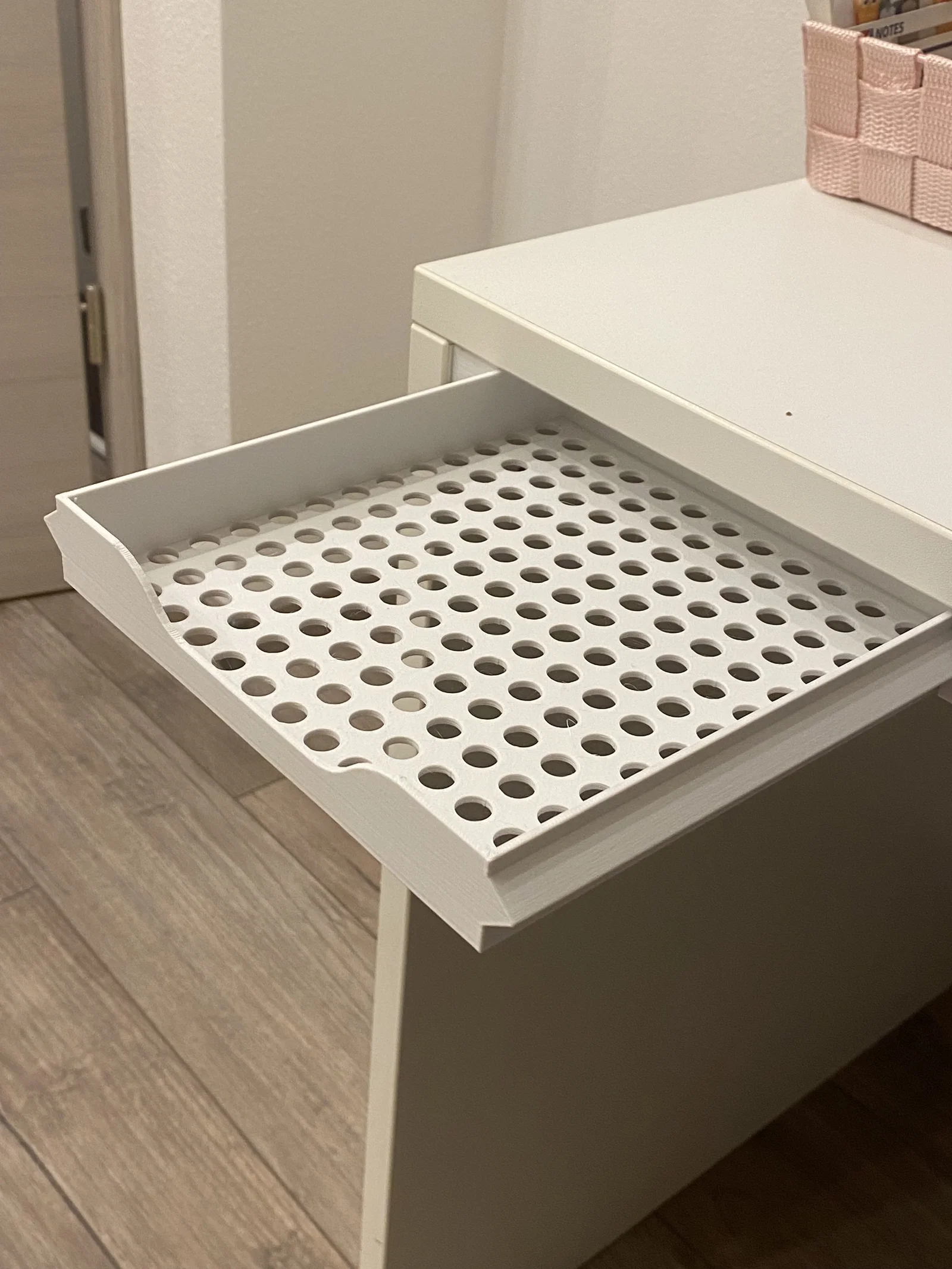 Điểm ấn tượng nhất của thiết kế này chính là phần đáy ngăn kéo được đục lỗ thoáng khí, vừa giúp giảm thiểu lượng nhựa in cần thiết mà vẫn giữ được độ cứng cáp cần thiết, vừa tạo cảm giác hiện đại, thanh thoát. Bạn có thể sử dụng ngăn kéo này để đựng văn phòng phẩm, phụ kiện điện tử nhỏ, hay các vật dụng cá nhân hay dùng hằng ngày. Cơ chế trượt mượt mà giúp bạn thao tác kéo ra vào nhanh chóng, mang lại sự tiện nghi tối đa cho không gian làm việc hoặc học tập của mình.