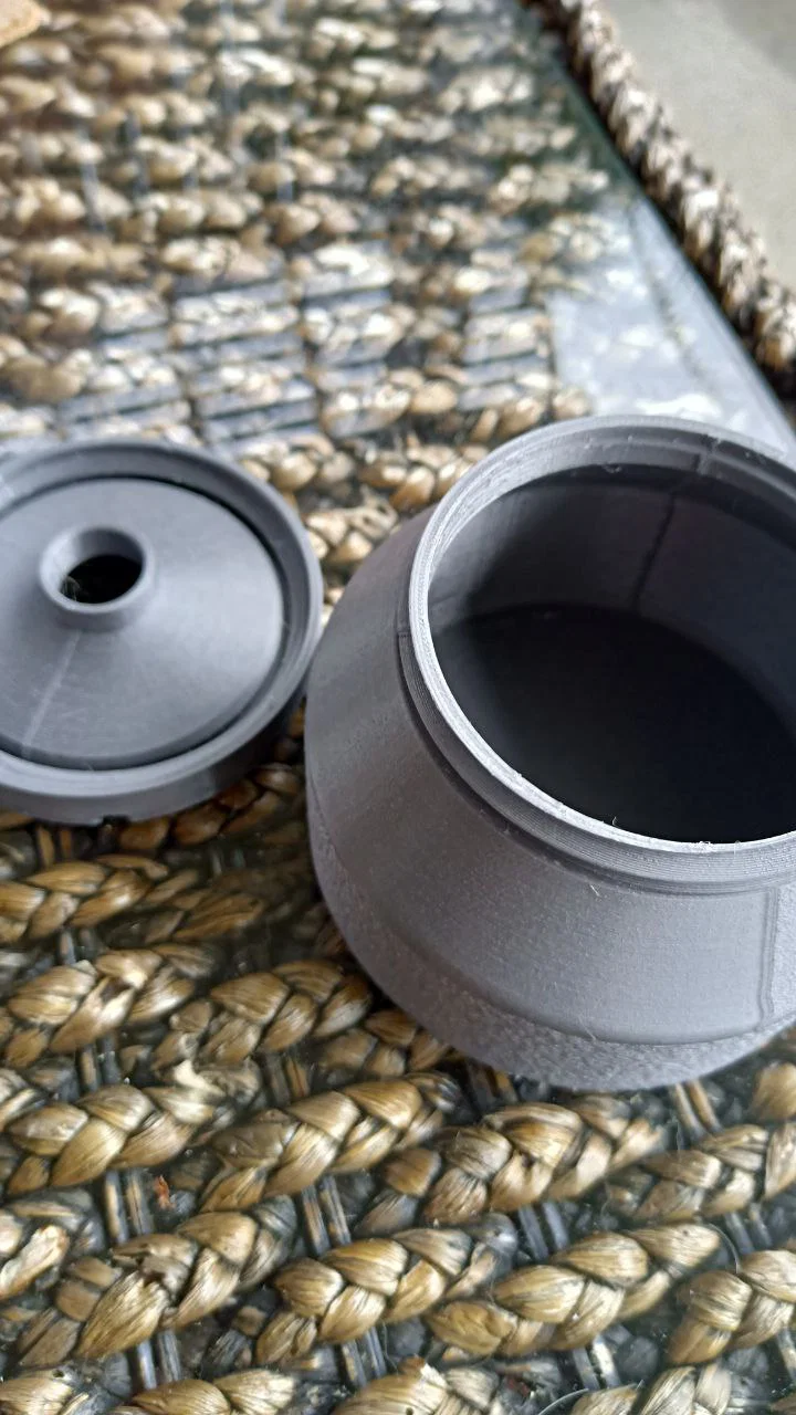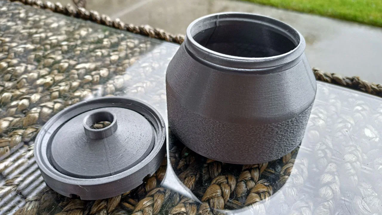 Mẫu gạt tàn Butt Bucket kích thước lớn cho những buổi tiệc. Sản phẩm có kích thước đế 120mm, chiều cao 80mm và phần nắp 80mm. Bạn có thể in bằng nhựa PETG với thiết lập hỗ trợ phù hợp để có kết quả tốt nhất.