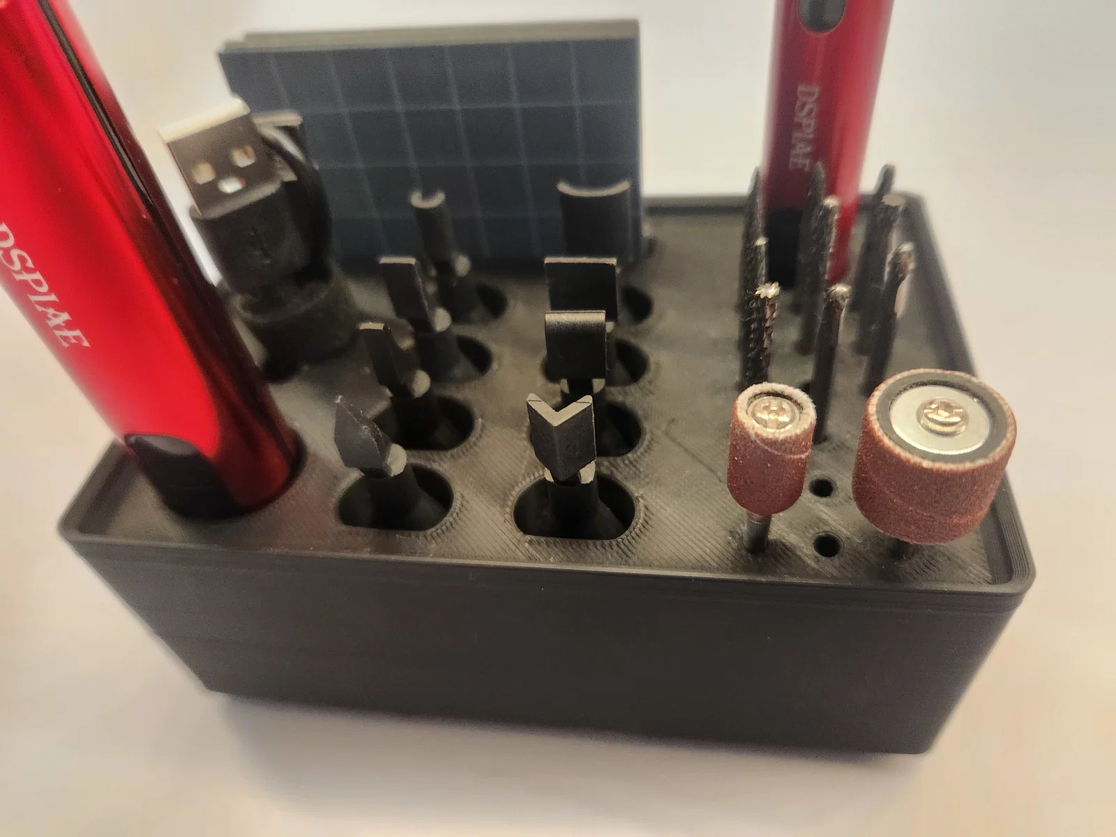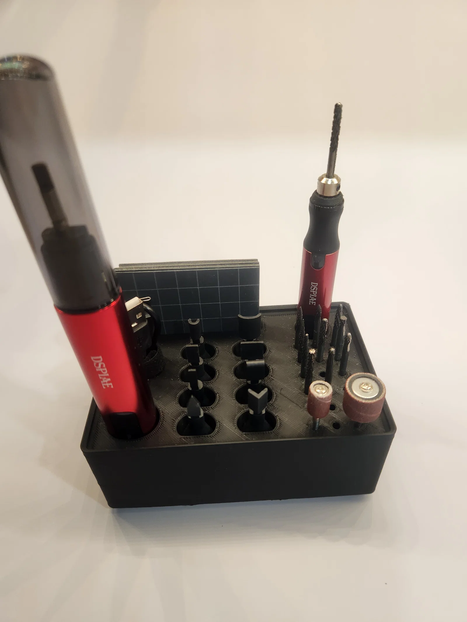 Giải pháp lưu trữ tối ưu cho bút và máy chà nhám rung Dspiae với hệ thống Gridfinity. Thiết kế này giúp bạn sắp xếp gọn gàng từ máy, giấy nhám, đầu mài cho đến cáp sạc, giúp không gian làm việc trở nên ngăn nắp và khoa học hơn bao giờ hết.