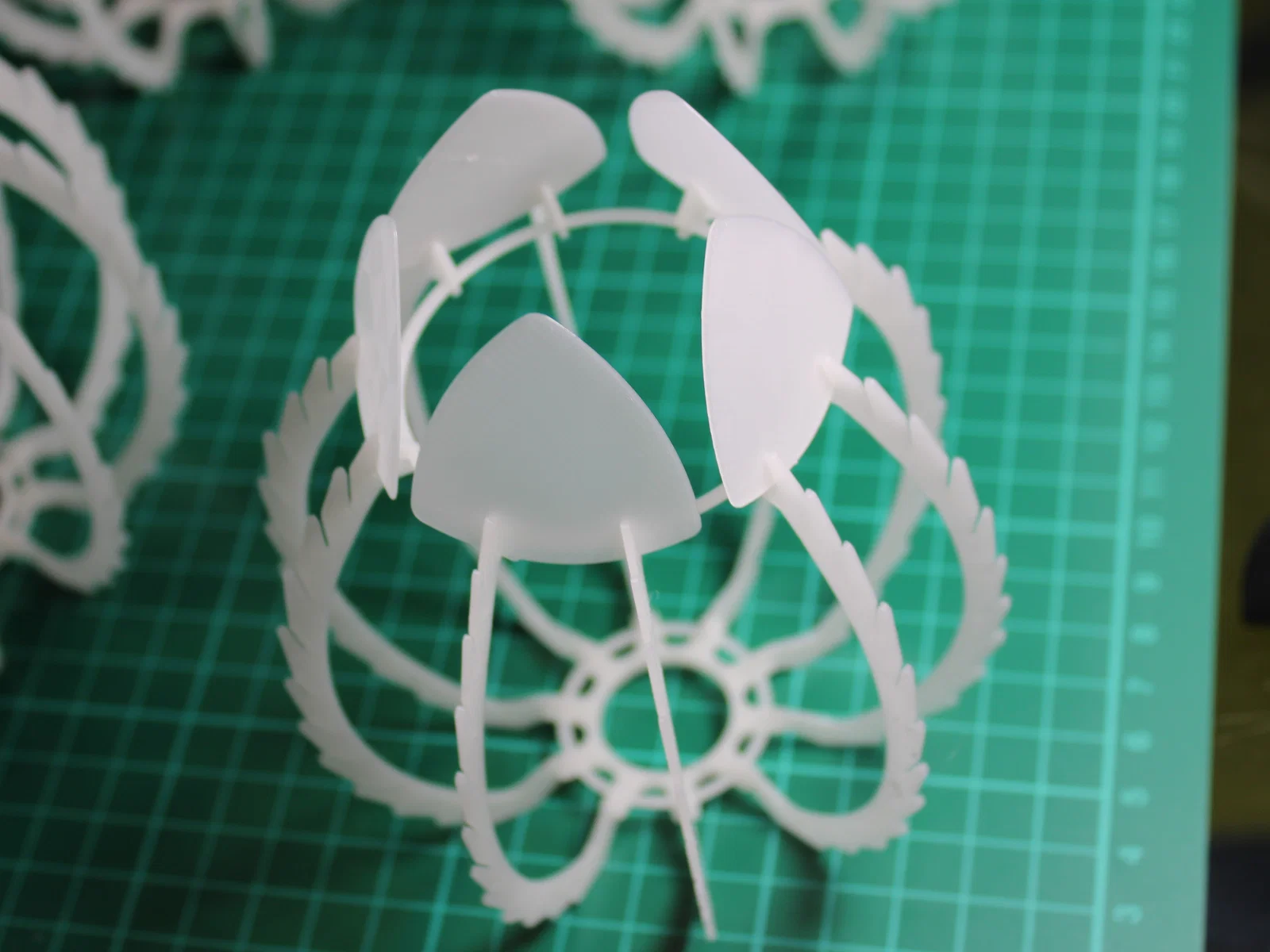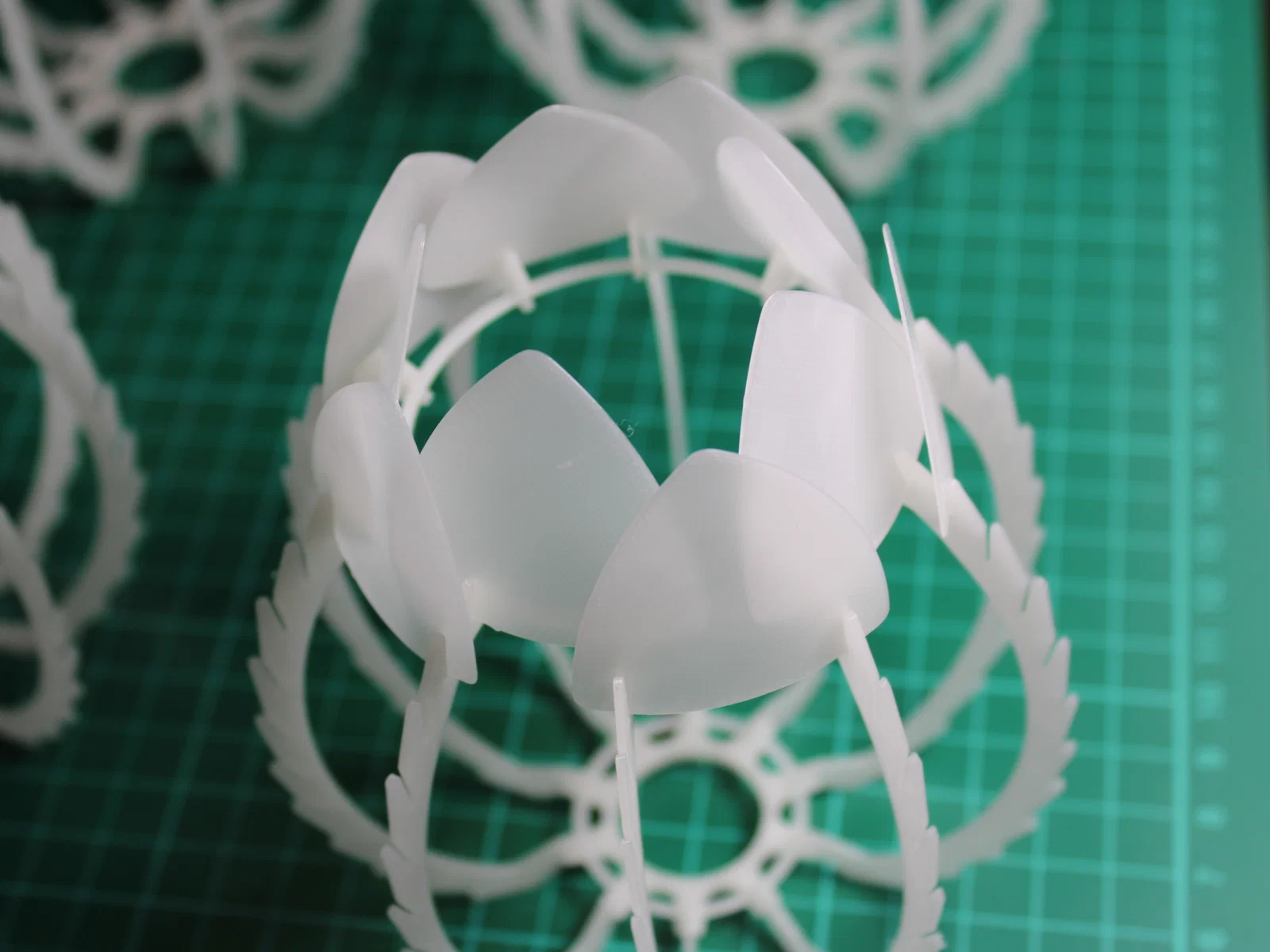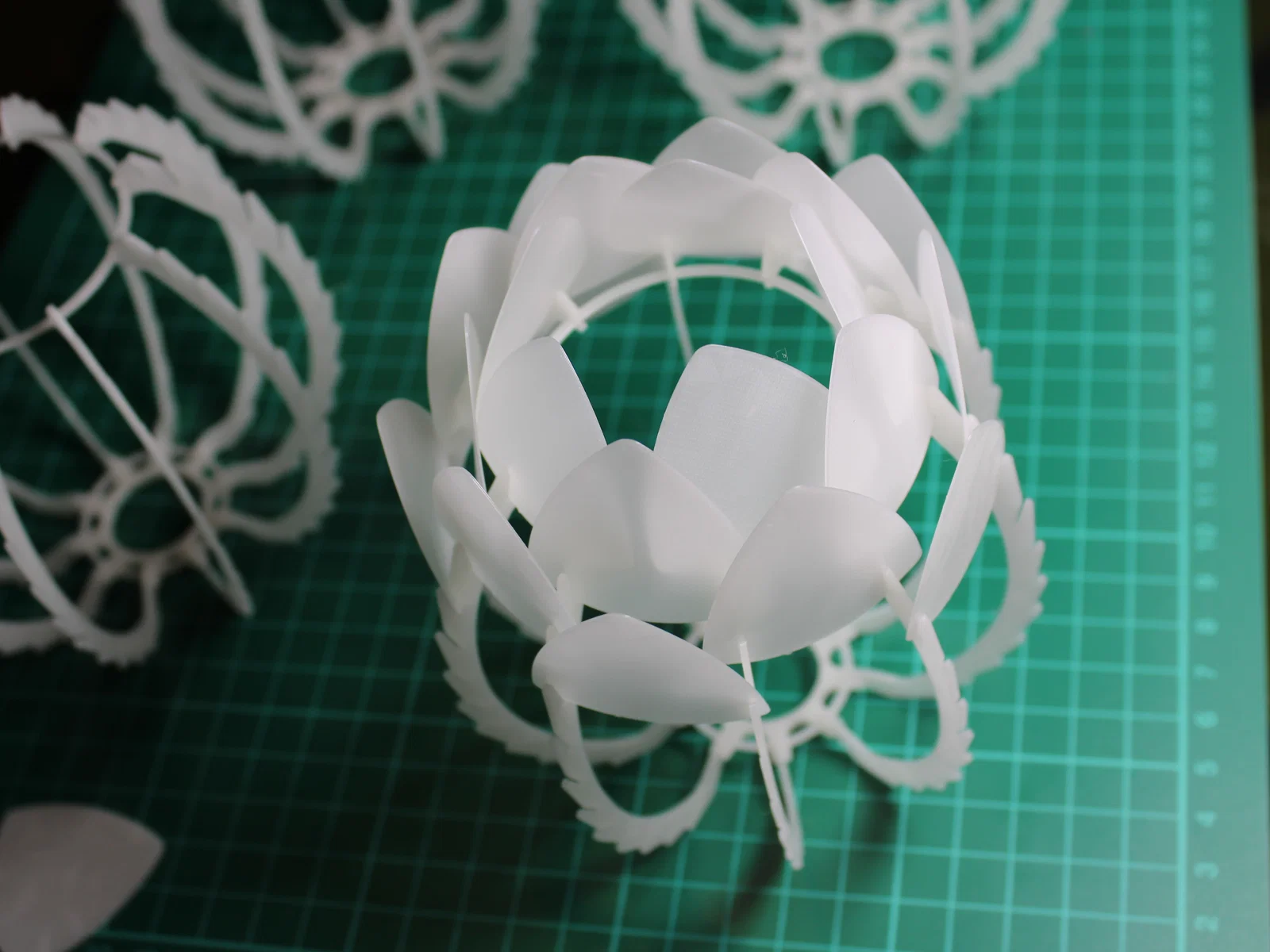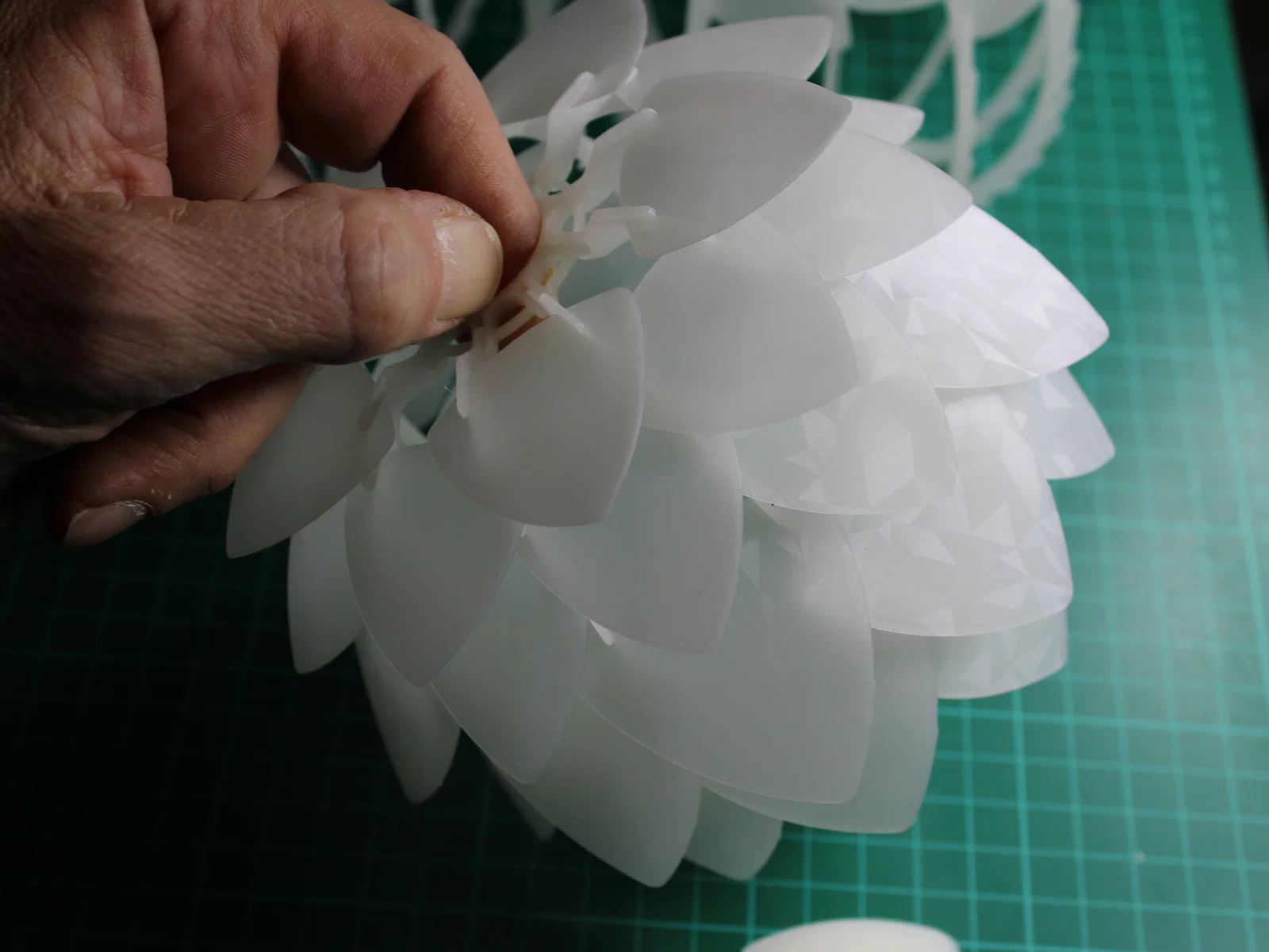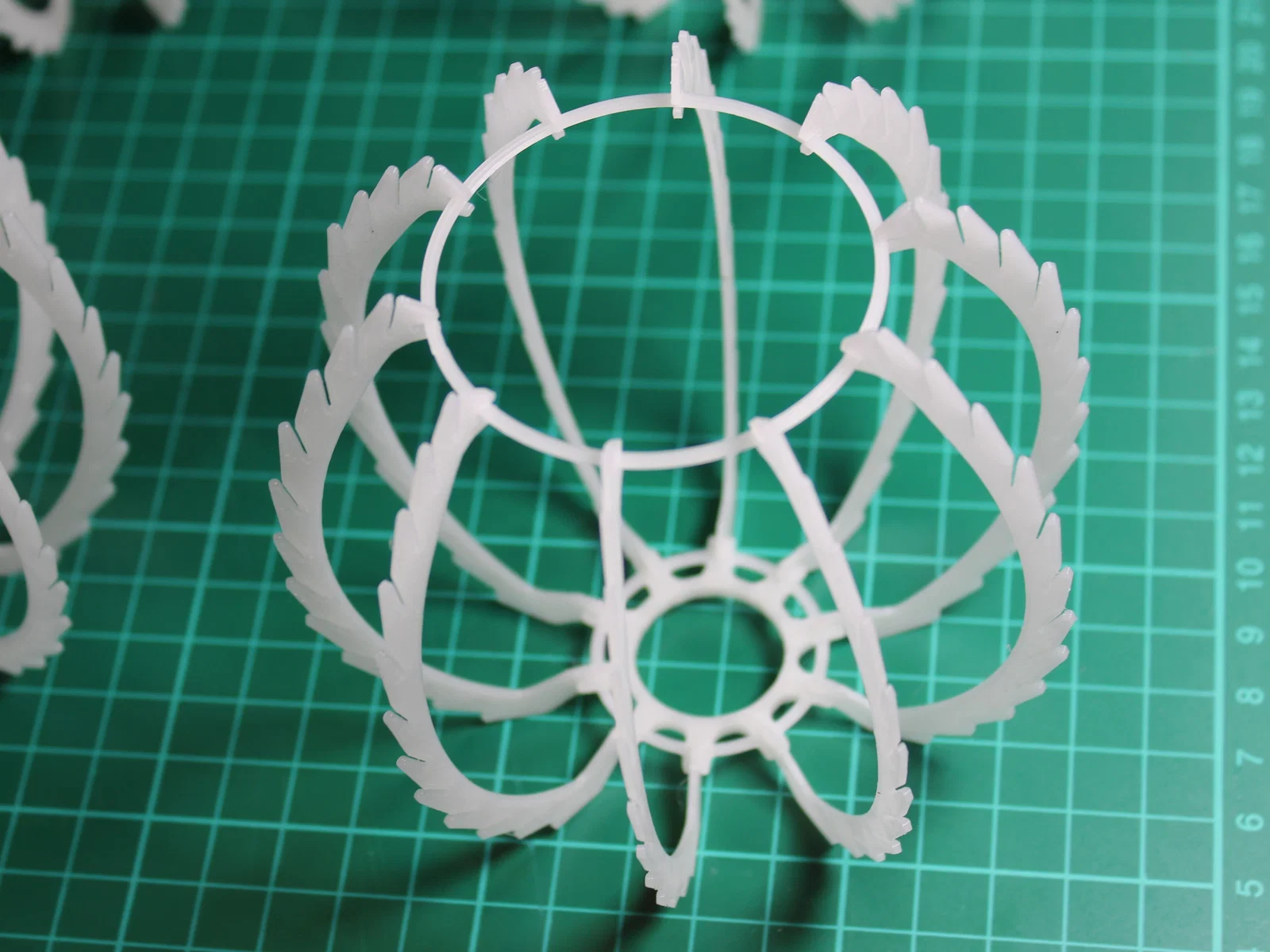 Lắp ráp phần khung trước nhé. Các bộ phận nên được lắp khớp nối ma sát (friction fit) với nhau. Sau đó, hãy gắn các cánh hoa nhỏ ở tầng dưới cùng trước để dễ dàng căn chỉnh đều 10 thanh đỡ xung quanh.