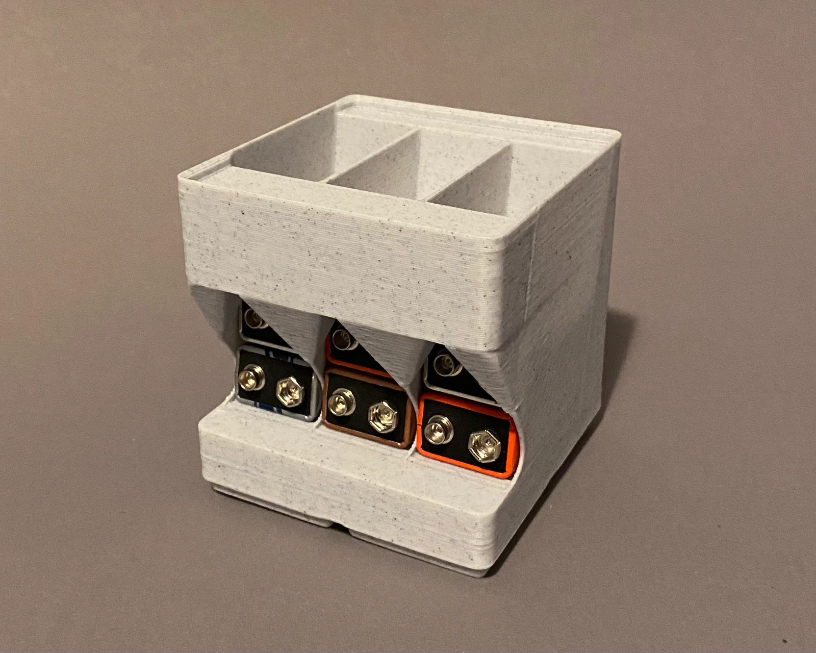 Giải pháp tiện lợi để sắp xếp và sử dụng pin 9V. Khay được thiết kế theo chuẩn Gridfinity, chiếm không gian 2x2x2 ô và có sức chứa tối đa lên đến 12 viên pin 9V, giúp góc làm việc của bạn gọn gàng hơn hẳn.