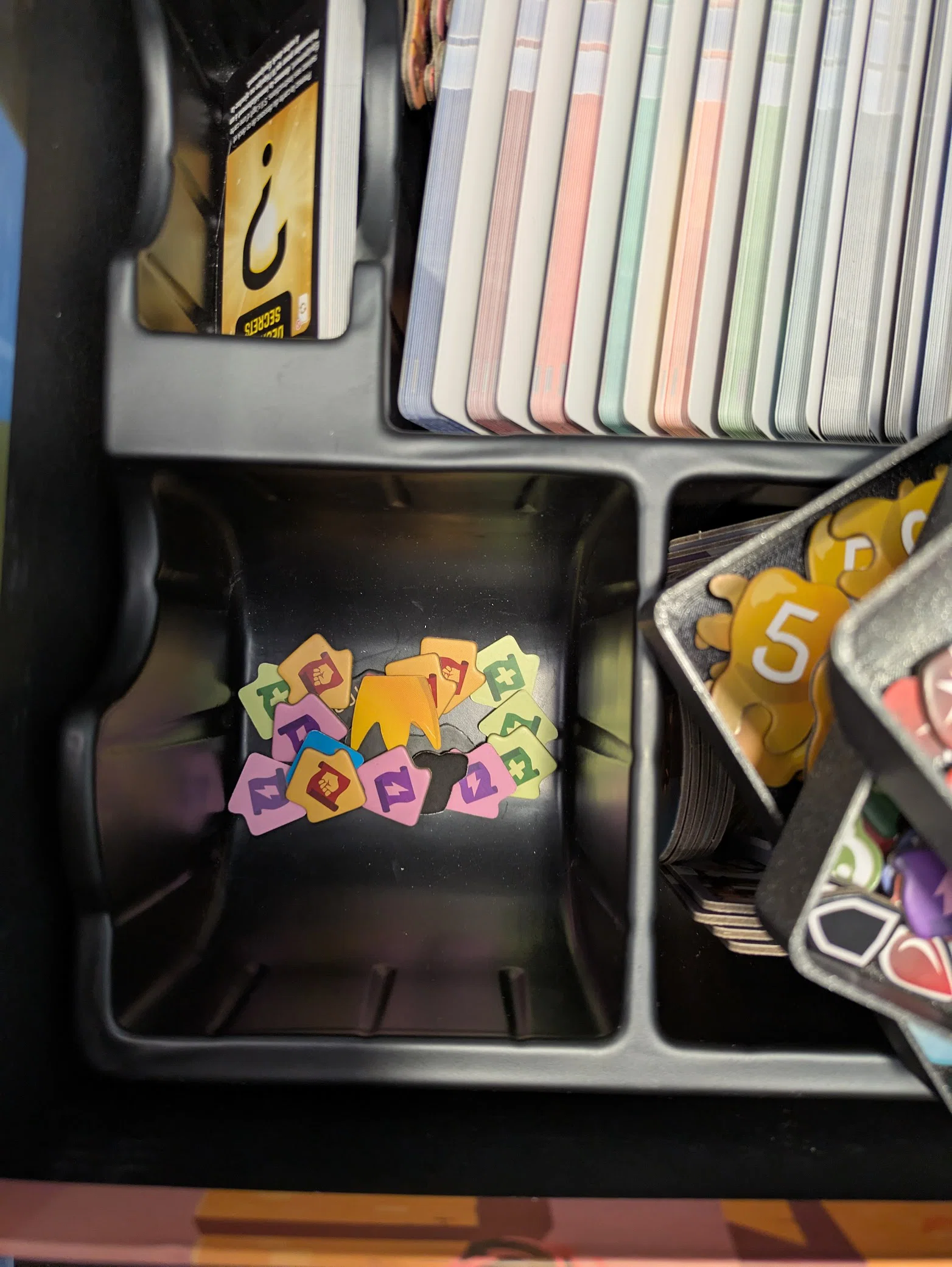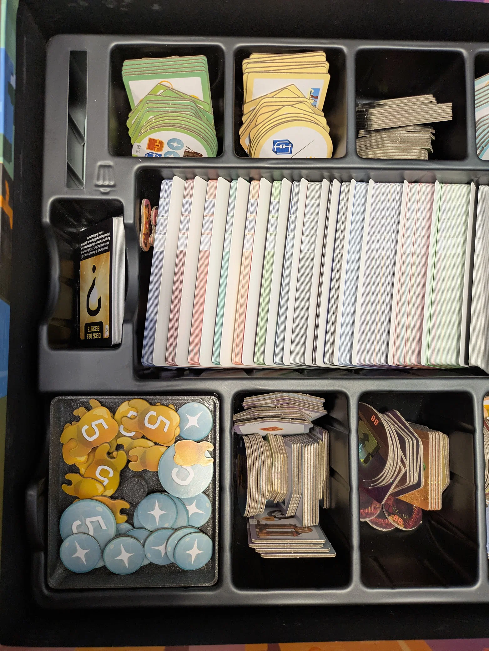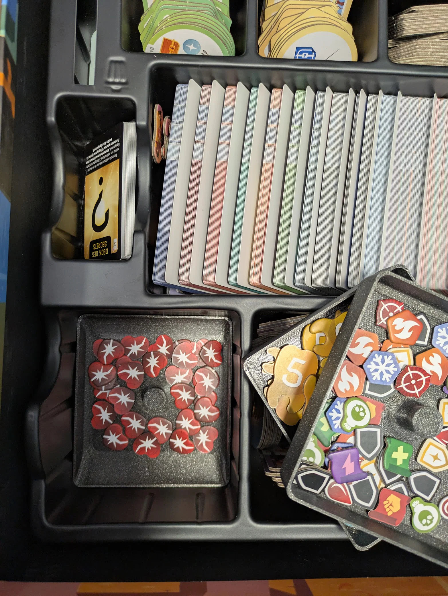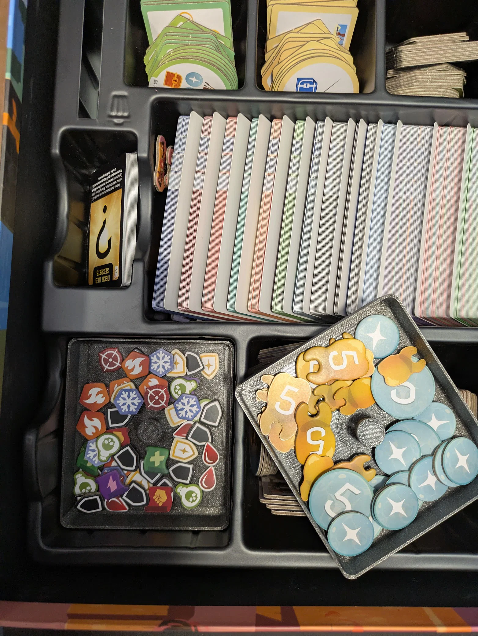 Ngoài ra còn có thêm 1 hộp thứ 4 để chèn cố định thẻ bài. Hộp này cũng có thể dùng để đựng token người chơi và các loại token lớn khác.