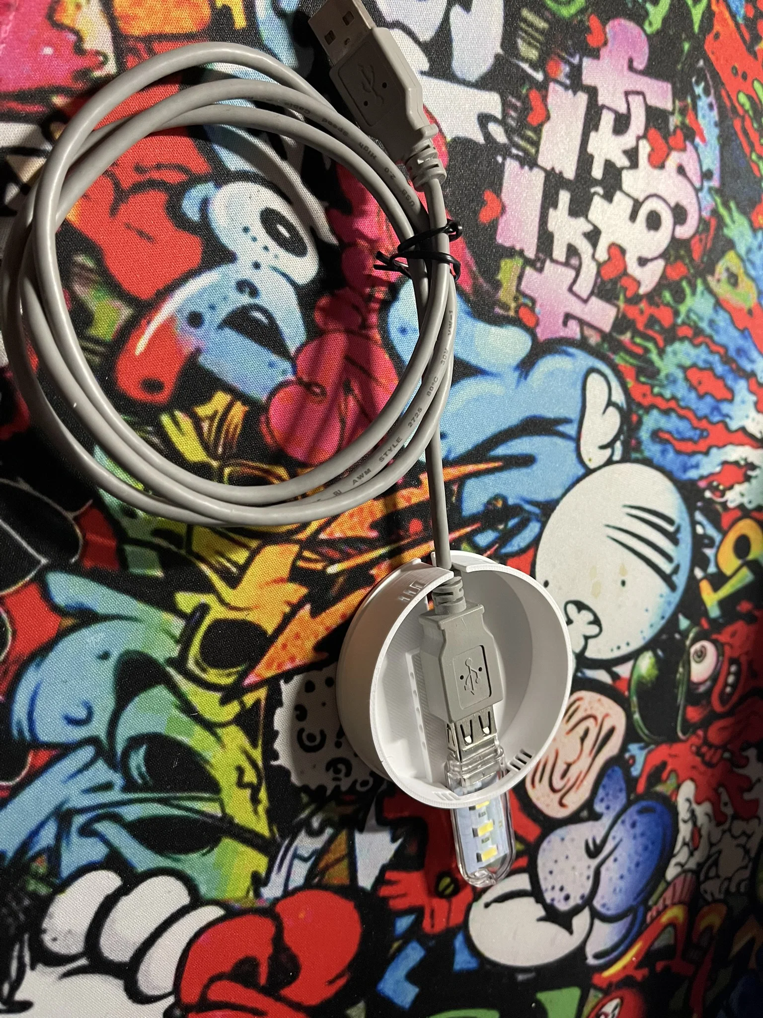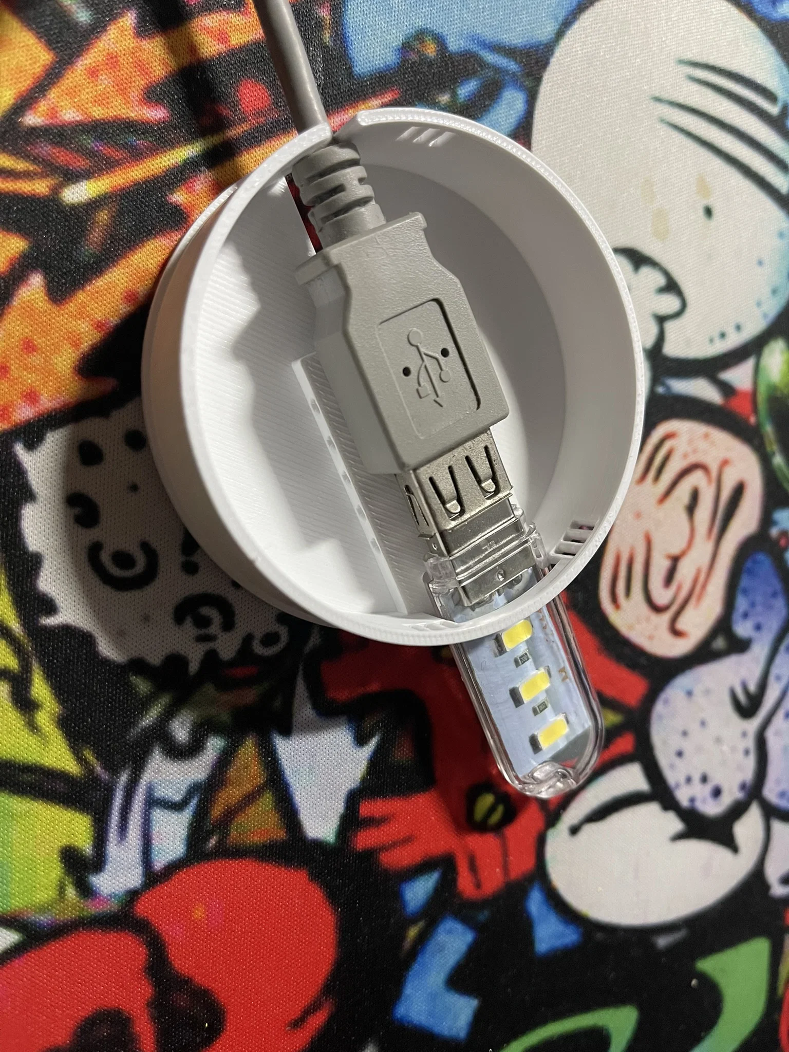 Phần đèn chiếu sáng thì tùy chọn, nhưng mình gợi ý hai phương án. Một là dùng "puck" đèn có sẵn trên Bambu Store - LED Lamp Kit 001 (mã MH001), hoặc phương án thứ hai là dùng đèn USB 3LED kết hợp với cáp nối dài USB-A (đầu đực-cái). Để cấp nguồn, bạn sẽ cần một củ sạc điện thoại có đầu ra USB 5V (tối đa 1A - khoảng 0.6A) hoặc dùng sạc dự phòng. Bộ kit MH001 đã được tích hợp sẵn công tắc, còn phương án thứ hai thì không, nhưng các bạn hoàn toàn có thể tự chế thêm công tắc nếu muốn. Mình đã thử qua nhiều phương án khác như dải LED RGB, nhưng vì loại trên thị trường rất đa dạng nên mình không thiết kế giá đỡ riêng cho loại đó.