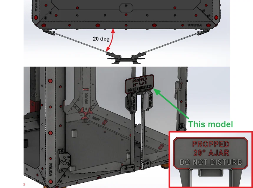 ** Nếu bạn đã in tất cả các bản nâng cấp của mình để bịt kín tủ in, chắc chắn bạn sẽ thấy nó giữ nhiệt tốt hơn hẳn. Tuy nhiên, khi in PLA, bạn cần giữ cho tủ in đủ mát trong khi vẫn phải ngăn luồng gió gây cong vênh sản phẩm. Mô hình này giúp thoát bớt nhiệt ra ngoài, đồng thời giữ cố định cánh cửa, giúp ngăn chặn gió lùa hoặc các luồng không khí bất chợt có thể làm ảnh hưởng đến bản in của bạn. Giờ đây bạn có thể tự tin in ấn với hầu hết mọi loại vật liệu mình muốn! Đặc điểm: 1. Đỡ cửa mở ở góc 20°. 2. Có kèm thông điệp “Do Not Disturb” (Xin đừng làm phiền) để hạn chế gió lùa. 3. Có kèm phiên bản trống để bạn tự thêm thông điệp tùy ý hoặc để trống tùy thích. ** Nếu bạn thêm mô hình này vào bộ sưu tập hoặc tải xuống, hãy nhấn nút LIKE và tặng mình vài SAO nhé! Nhớ rằng, bạn có thể kiếm thêm Prusameters nếu đăng ảnh sản phẩm đã in xong! Hơn nữa, nhìn thấy thành quả của các bạn là niềm vui lớn của mình đấy. ;-D Chúc bạn in ấn vui vẻ! Tái bút: Hãy để lại phản hồi mang tính xây dựng nếu bạn muốn mình cải thiện thêm điều gì nhé.