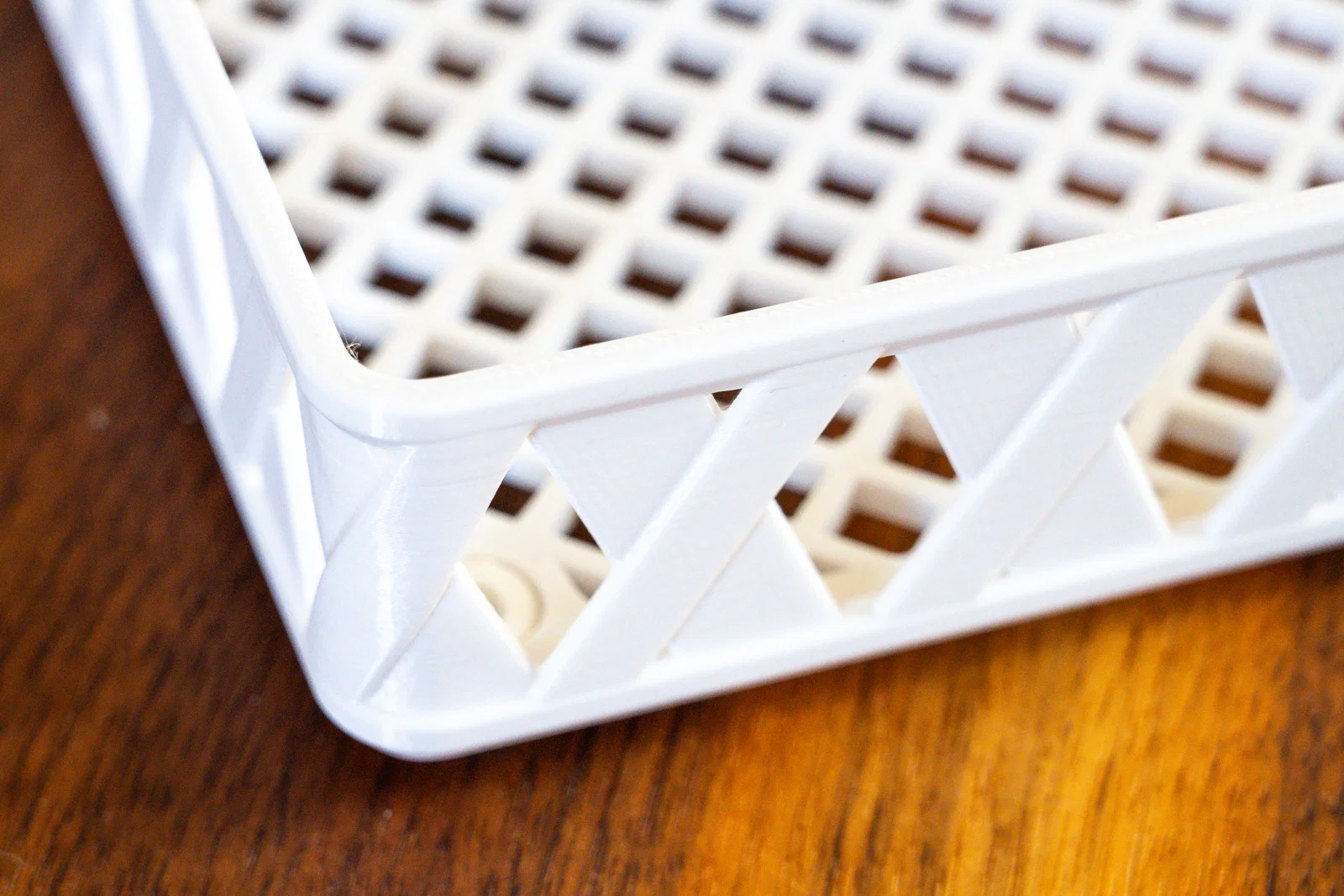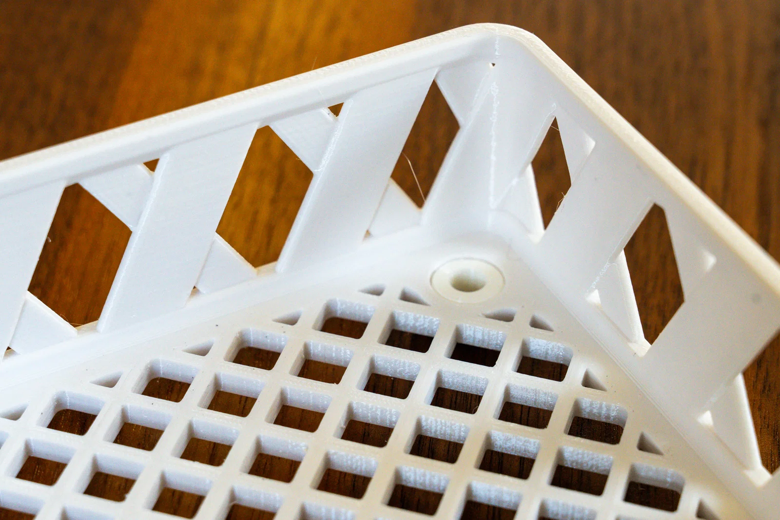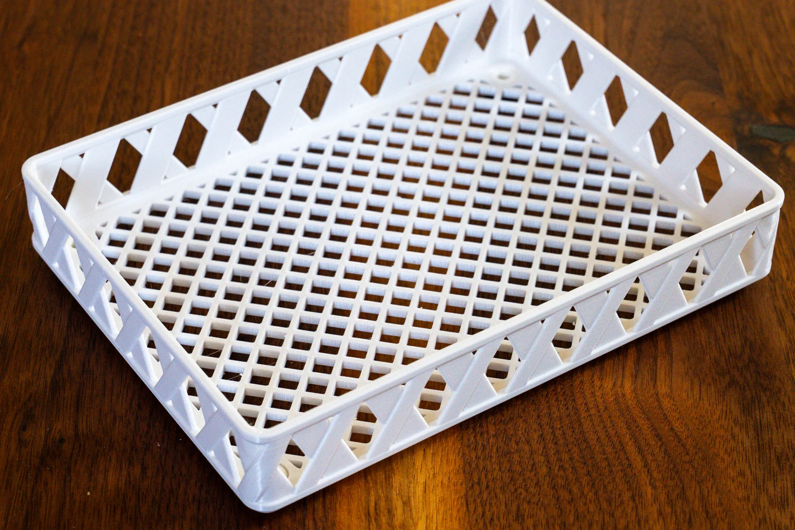 Thiết kế này được tối ưu để in bằng PETG nhằm đảm bảo độ bền chắc, nhưng bạn vẫn có thể dùng PLA hoặc các loại nhựa khác. Ví dụ, phần đáy giỏ được làm dày (4 mm) để tạo độ cứng cáp cho cấu trúc lưới.
