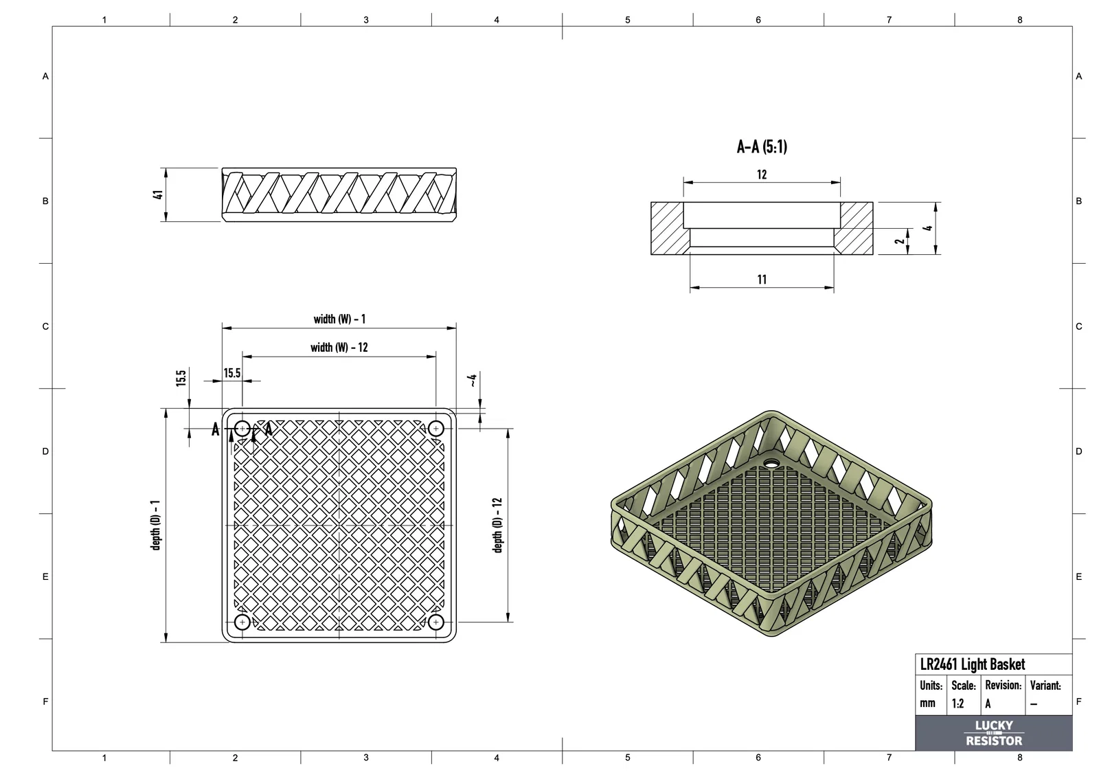 Tên file đã thể hiện rõ kích thước giỏ. Ví dụ: LR2461-W120-D060.3mf nghĩa là W120 (rộng 120 mm) và D060 (sâu 60 mm). Các kích thước còn lại được tính toán dựa trên thông số này. Bạn có thể xem hình vẽ trên để biết chi tiết.