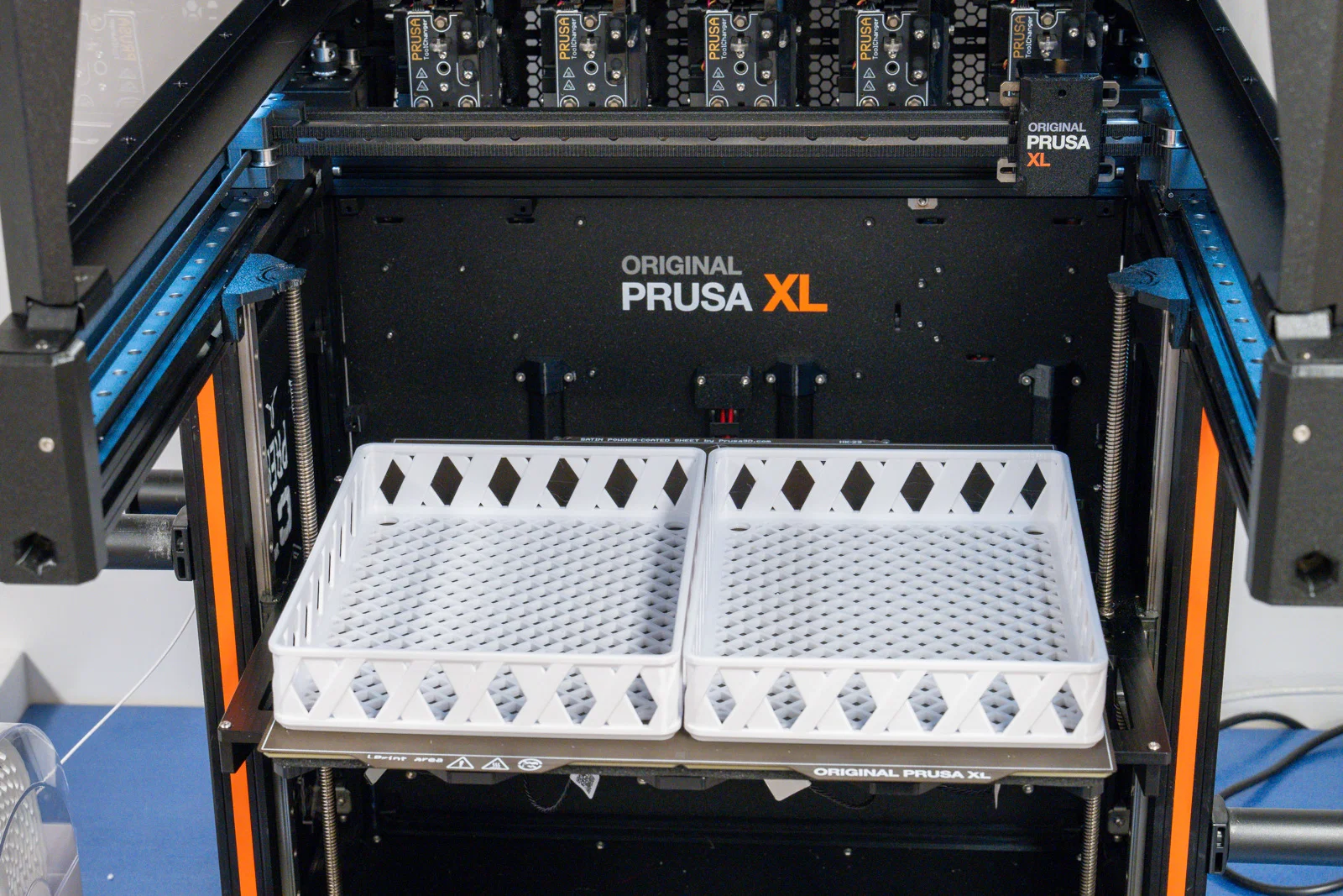 Các mẫu trong ảnh được in trên máy Prusa XL, vòi phun 0.4 mm, sử dụng nhựa Fiberlogy Easy PET-G màu trắng và TPU A95 của 3DJake cho phần chân đế.