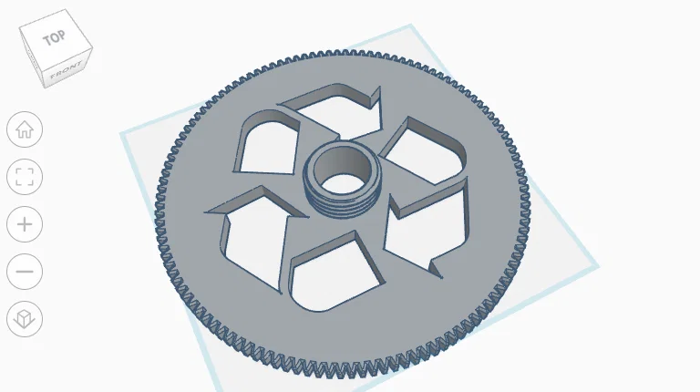 Mình đã remix lại phiên bản bánh răng lớn cho máy Recreator. Điểm khác biệt là mình đã bỏ bớt các ký tự chữ ở viền ngoài nhưng vẫn giữ lại biểu tượng tái chế để thiết kế nhìn gọn gàng hơn, giúp tiết kiệm nguyên liệu và giảm thời gian in đáng kể.