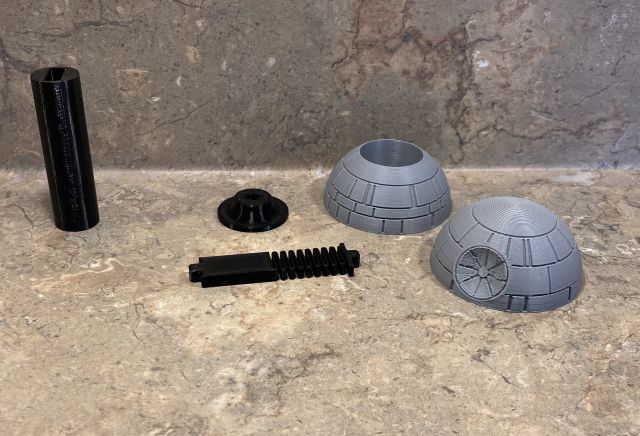 Đây là mô hình Death Star (Ngôi sao chết) trong loạt phim Star Wars phiên bản bobble-head (đầu lắc lư). Đồ chơi này sử dụng phần đế và lò xo in 3D, bên trong đế có một hốc nhỏ để gắn nam châm 8mm.