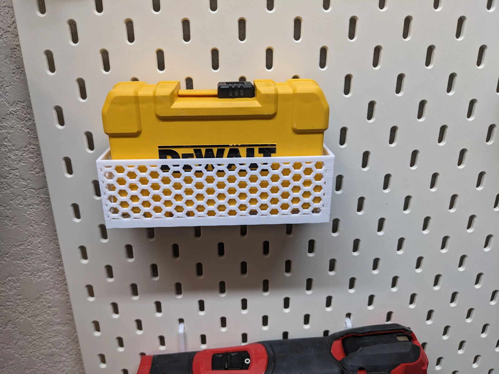 Bản remix của khay Skadis với họa tiết hình lục giác ở các mặt ngoài giúp tiết kiệm nhựa và giảm thiểu tối đa support khi in. File kèm theo tối ưu cho hộp mũi khoan Dewalt, có sẵn file SCAD để tùy chỉnh.
