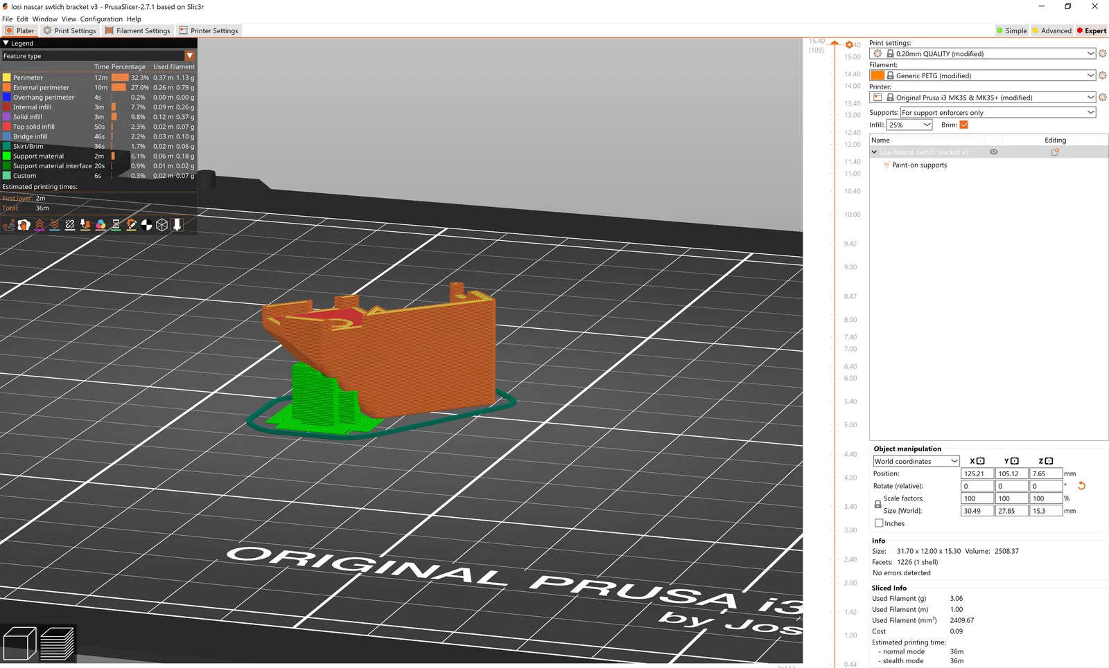 Tôi in bằng nhựa PETG đen của Hatchbox, đặt ngược trên bàn in và có sử dụng support như hình (do gặp chút vấn đề về quạt làm mát nên tôi đã phải xoay lại hướng in trên bàn):