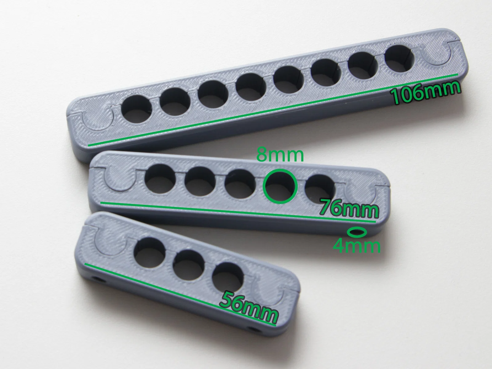 Bộ phụ kiện này bao gồm nhiều kích thước khác nhau với số lượng khe cắm từ 3, 5 cho đến 8 lỗ, cho phép bạn linh hoạt lựa chọn tùy theo số lượng thiết bị đang dùng. Đường kính mỗi khe cắm là 8mm, hoàn hảo cho hầu hết các loại dây cáp phổ biến như cáp sạc điện thoại, cáp HDMI hoặc dây mạng. Bạn có thể dễ dàng cố định nó lên tường, mặt bàn hoặc cạnh bàn bằng cách bắt vít hoặc dùng băng dính hai mặt chuyên dụng, tùy thuộc vào bề mặt lắp đặt.
