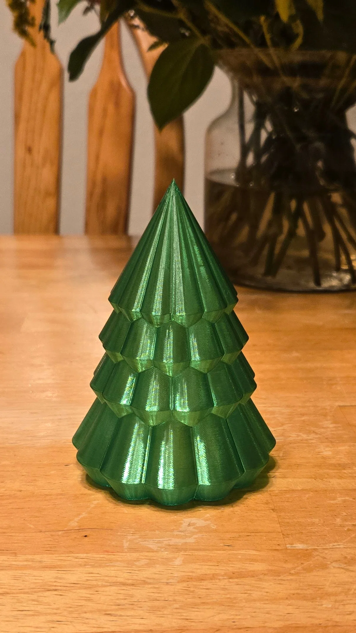 Mình in cây thông ở chế độ spiral mode (vase mode) với độ cao lớp in (layer height) là 0.2mm. Bạn nên cài đặt in 8 lớp cho phần đế để tăng độ cứng cáp cho sản phẩm. Phần khay đỡ đèn tea light thì in như bình thường với layer height 0.2mm.