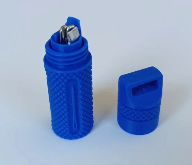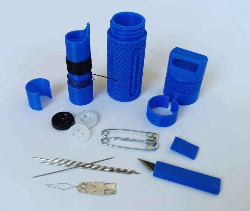 Mẫu thiết kế này là một bộ kim chỉ du lịch, được tạo ra để mang theo mọi thứ cần thiết cho những tình huống khẩn cấp trong một thiết kế nhỏ gọn và chắc chắn. Tôi đã dựa trên mẫu trước đây của mình để phát triển, nhưng phần nội thất bên trong đã được tái cấu trúc hoàn toàn. Bộ kit này được thiết kế để chứa: 3 cúc áo (nhỏ hơn 14mm), từ 5 đến 10 cây kim, 2 ghim băng, một dụng cụ xỏ kim (phần đầu cần được cắt ngắn lại), chỉ, một lưỡi dao nhỏ và một chiếc đê khâu (thimble) được in 3D. Chiếc đê khâu cần được in theo phong cách tối giản để có thể vừa vặn bên trong phần nắp hộp. Phần lưỡi dao được làm bằng cách bẻ nhỏ lưỡi dao dọc 30° (9mm) và dán nó vào cán cầm đã in (Ví dụ về loại lưỡi dao). Để lắp ráp bộ kit, trước tiên hãy bỏ các cúc áo vào thân hộp. Sau đó, quấn chỉ quanh phần lõi và cố định lại bằng chốt giữ. Đặt dao, ghim băng, kim và dụng cụ xỏ kim vào lõi rồi cho tất cả vào thân hộp. Cuối cùng, gắn đê khâu vào nắp và vặn chặt lại.