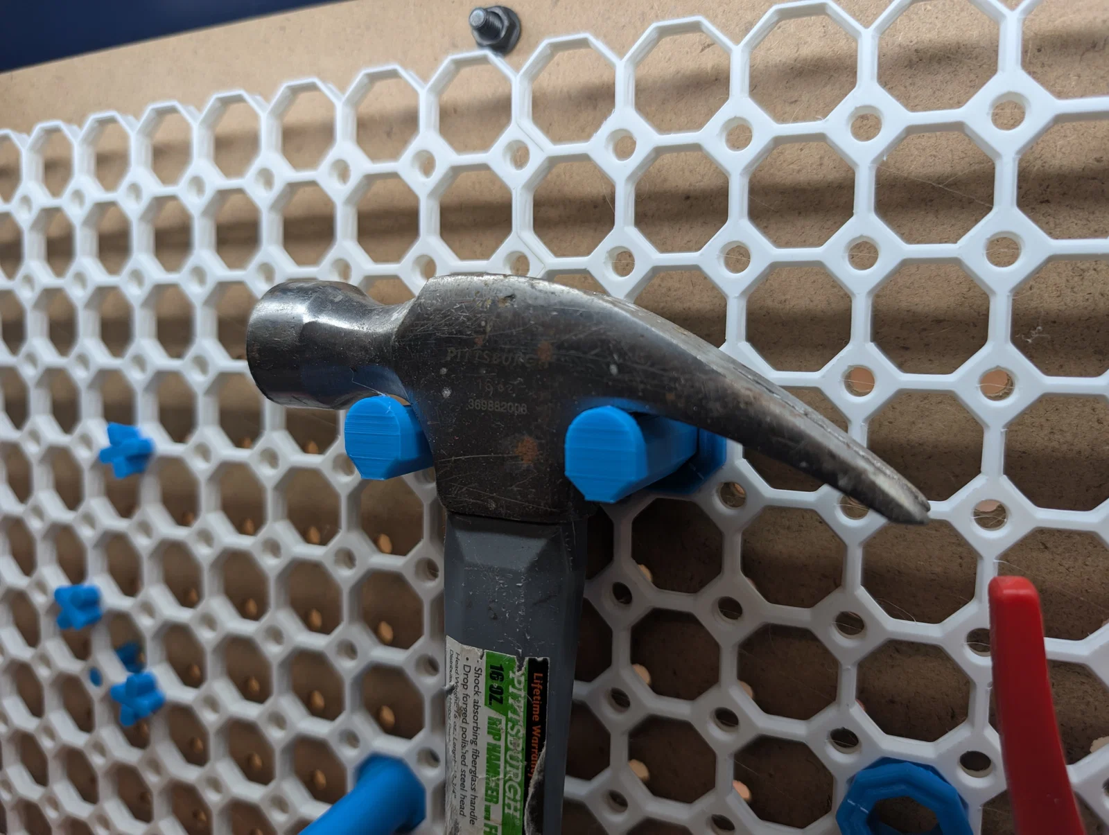 Mấy cái móc treo búa mình tìm thấy trước đây không chắc chắn lắm, nên mình tự thiết kế một cái dựa trên cơ chế push-fit của hệ thống multiboard. Ở đây có 2 biến thể cho anh em lựa chọn: loại 3 chấu và loại 2 chấu lệch.