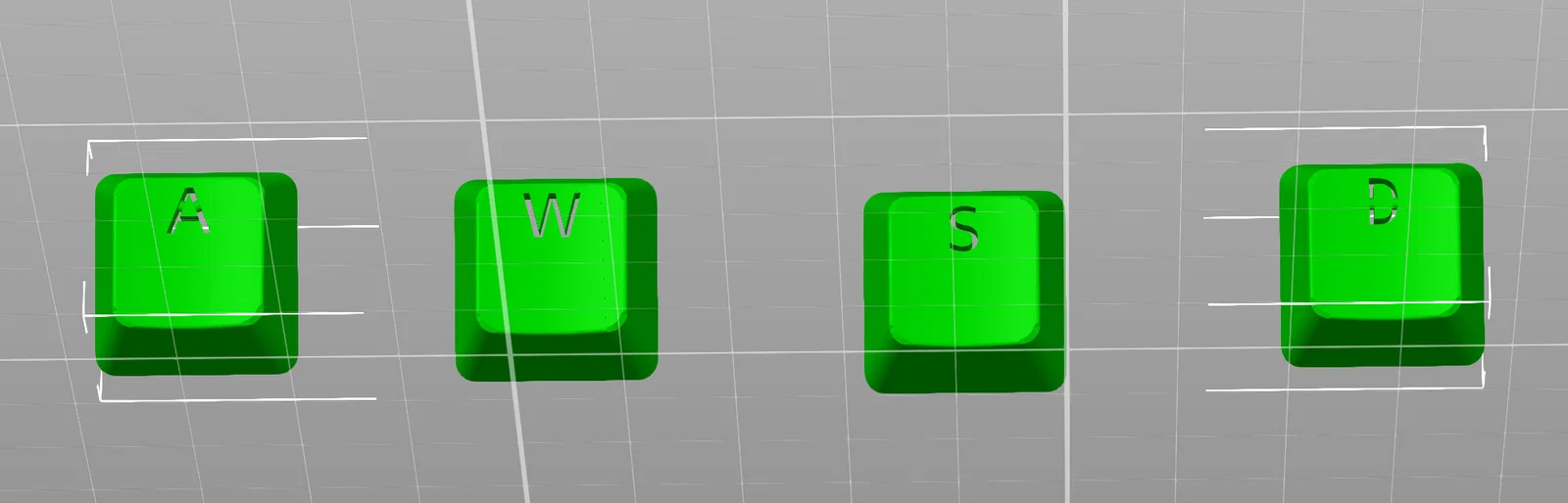 Mình muốn tìm vài phím trong suốt cho cụm WASD với phần ký tự được cắt rỗng, để phối cùng phím Escape và phím Any hiện có của mình. Những phím này được in bằng nhựa Overture PETG với độ phân giải 0.2mm. Mình giữ nguyên bề mặt in để có thể cảm nhận được chút khác biệt khi đặt tay lên bàn phím. Vì các phím có phần cạnh hơi cong, mình đã in bằng cách đặt mặt đáy phẳng xuống bàn in, nên cần phải dũa nhẹ một chút để lắp vào vừa vặn hoàn hảo.