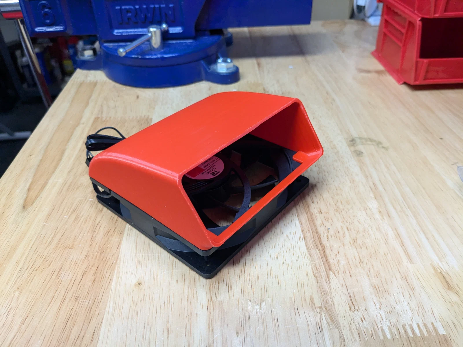 Tôi đang dùng cái tủ rack treo tường của Tripp-Lite có sẵn chỗ gắn quạt hút 120mm ở phía dưới. Tuy nhiên, gió thổi thẳng lên trên nên bị cản ngay bởi thiết bị đầu tiên trong tủ rồi tản ra xung quanh. Tôi đã thiết kế chi tiết này để hướng luồng gió ra phía sau, giúp làm mát cho các linh kiện khác hiệu quả hơn.