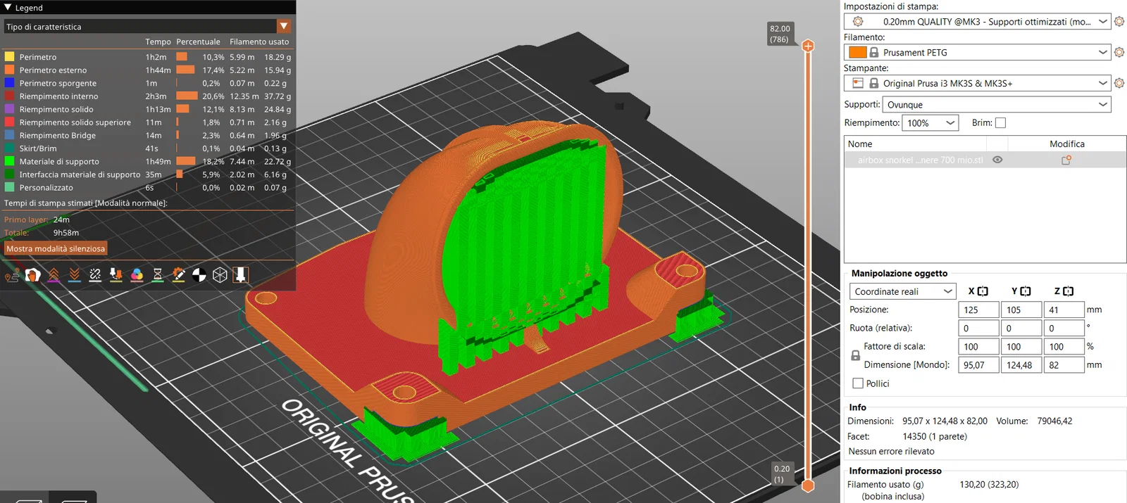 Chào các bạn, đây là bản remix của ống hút gió (snorkel) từ tác giả Chris1974. Mình đã thay đổi phần miệng hút ngang rộng bằng một thiết kế có hiệu ứng venturi, tương tự như thiết kế zin nhưng loại bỏ đường ống dẫn bên trong vốn làm giảm diện tích bề mặt của bộ lọc gió. Thiết kế này giúp hạn chế nước lọt vào hơn so với kiểu miệng hút phẳng hoàn toàn. Mình cũng đã bổ sung thêm vài chi tiết gia cố ở mặt trước và mặt sau cho chắc chắn hơn. Mình đang dùng món này với lọc gió giấy zin, lỗ hút gió có kích thước lớn hơn một chút so với nguyên bản. Mình in với độ dày lớp 0.2 mm, 100% infill, 2 perimeters và có sử dụng support.