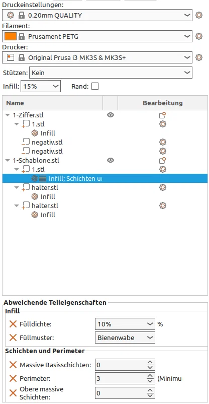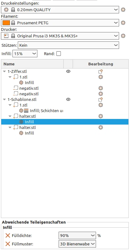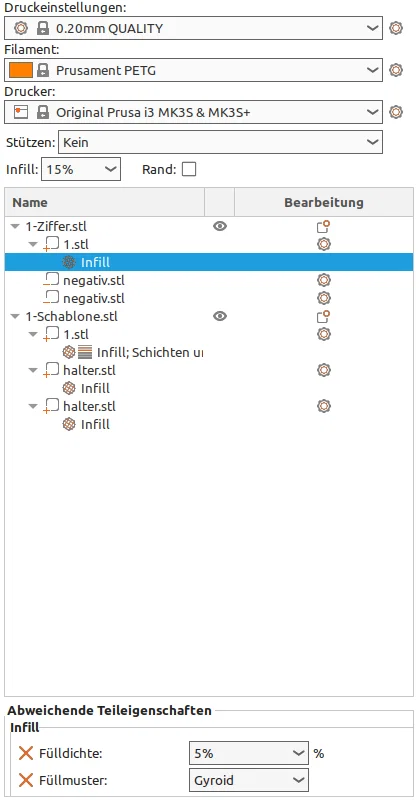 Tệp “nummern.3mf” bao gồm tất cả các số và ký hiệu, mỗi loại đi kèm với một khuôn khoan. Khuôn khoan cũng bao gồm các giá đỡ cho số đó. Để in, bạn cần đặt khuôn khoan và số vào khu vực in (hoặc chọn các tệp lẻ).