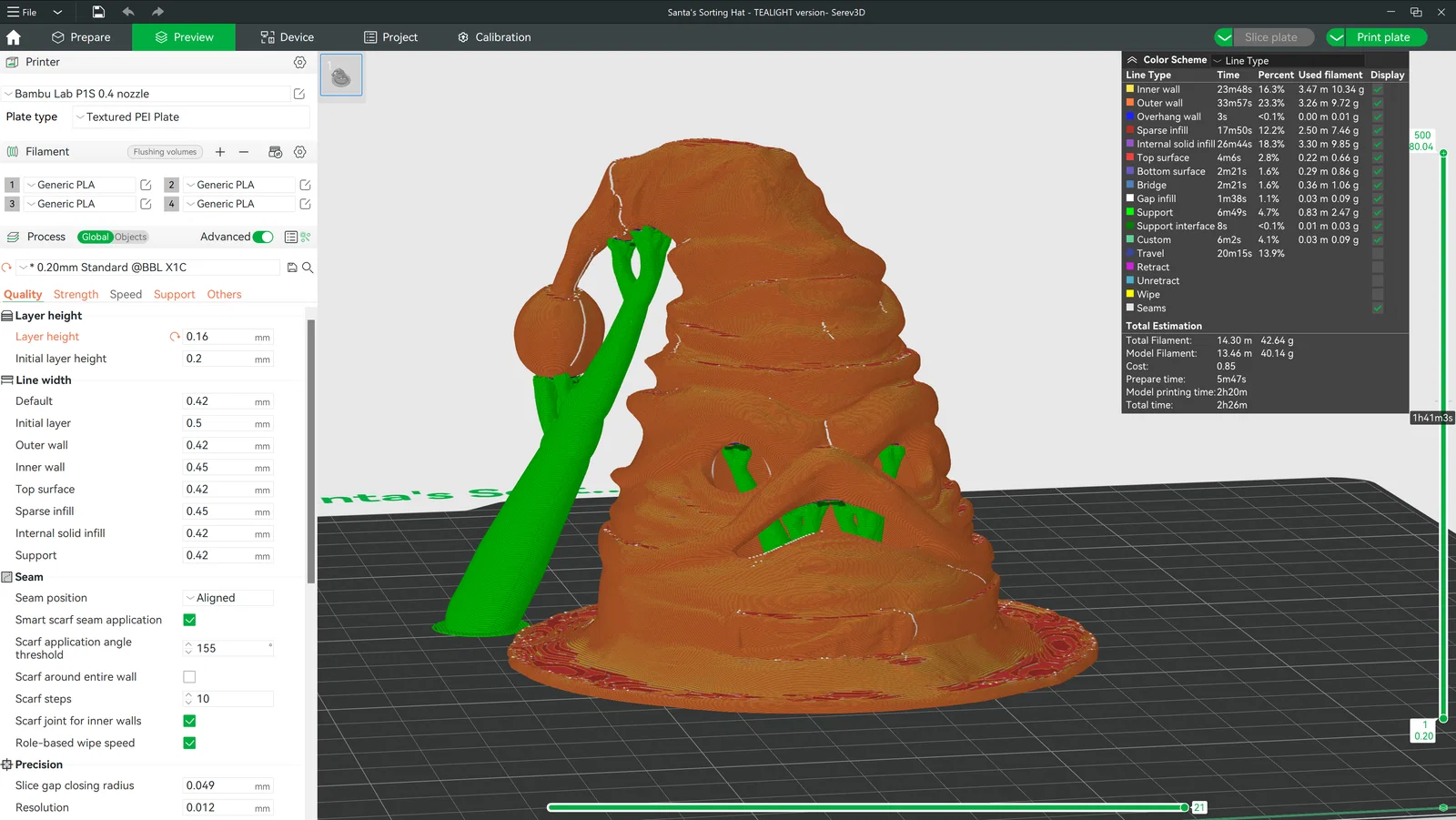 Vậy nên, đây là thành quả! Trên Makerworld, tụi mình chia sẻ miễn phí phiên bản dùng nến Tealight và đèn Puck Light, các bạn nhớ ghé qua Patreon của Serev3D để xem thêm phiên bản đội đầu đầy đủ của chiếc Nón Phân Loại ông già Noel này nhé, bạn có thể đội lên đầu để xem năm nay mình là người ngoan hay hư nè!