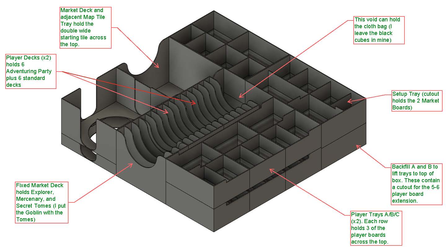 Túi vải sẽ đặt vừa vào khoảng trống nhỏ. Bạn hãy chia các loại token vào khay “Setup” (Thiết lập) và khay “Token” tùy theo nhu cầu của mình. Mục tiêu của mình là để một khay trên bàn khi chơi và khay còn lại vẫn nằm trong hộp sau khi thiết lập xong.
