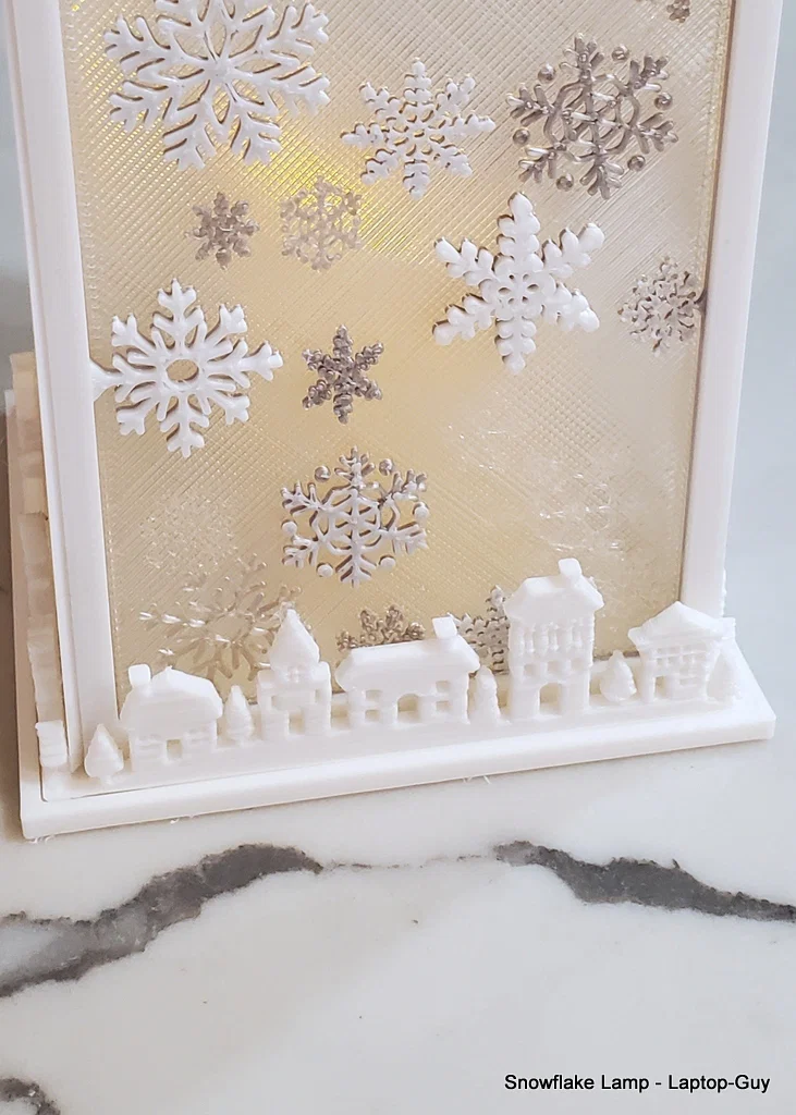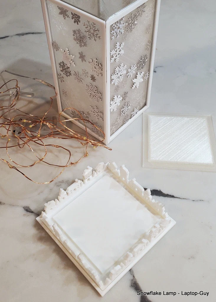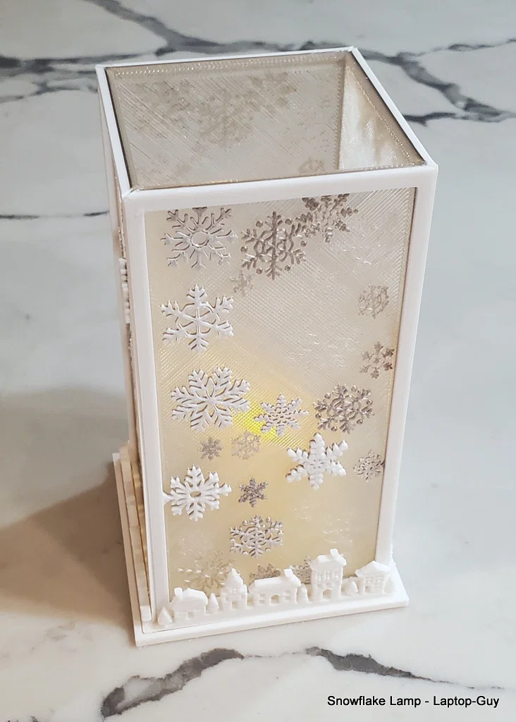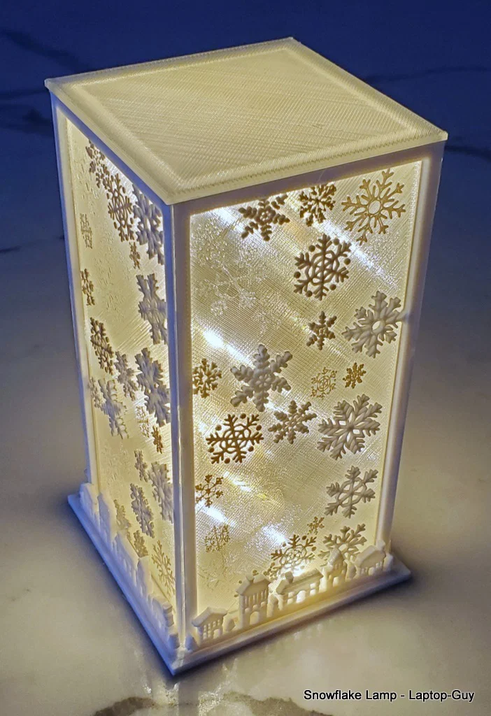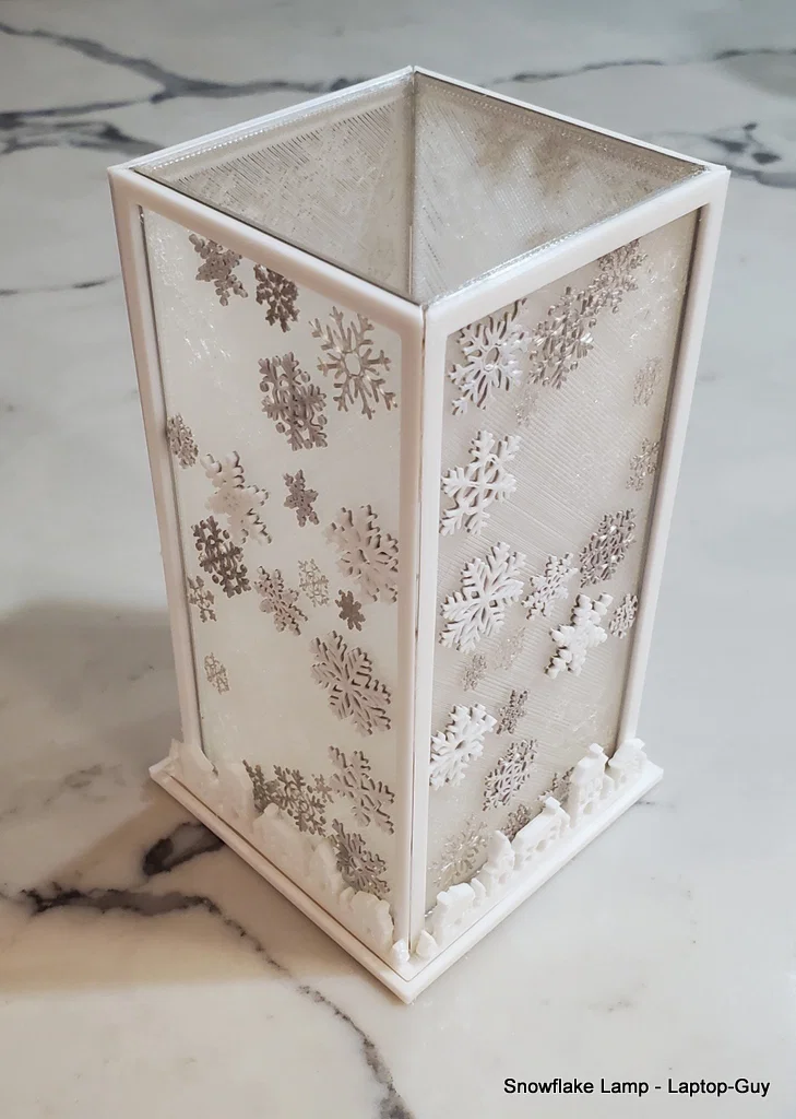 Mẫu đèn lồng bông tuyết tinh tế dùng cho đèn LED dây hoặc nến điện tử. Thiết kế gồm 4 tấm panel vát góc 45 độ, in bằng nhựa PLA với kỹ thuật đổi màu linh hoạt, tạo không khí ấm cúng cho mùa lễ hội.