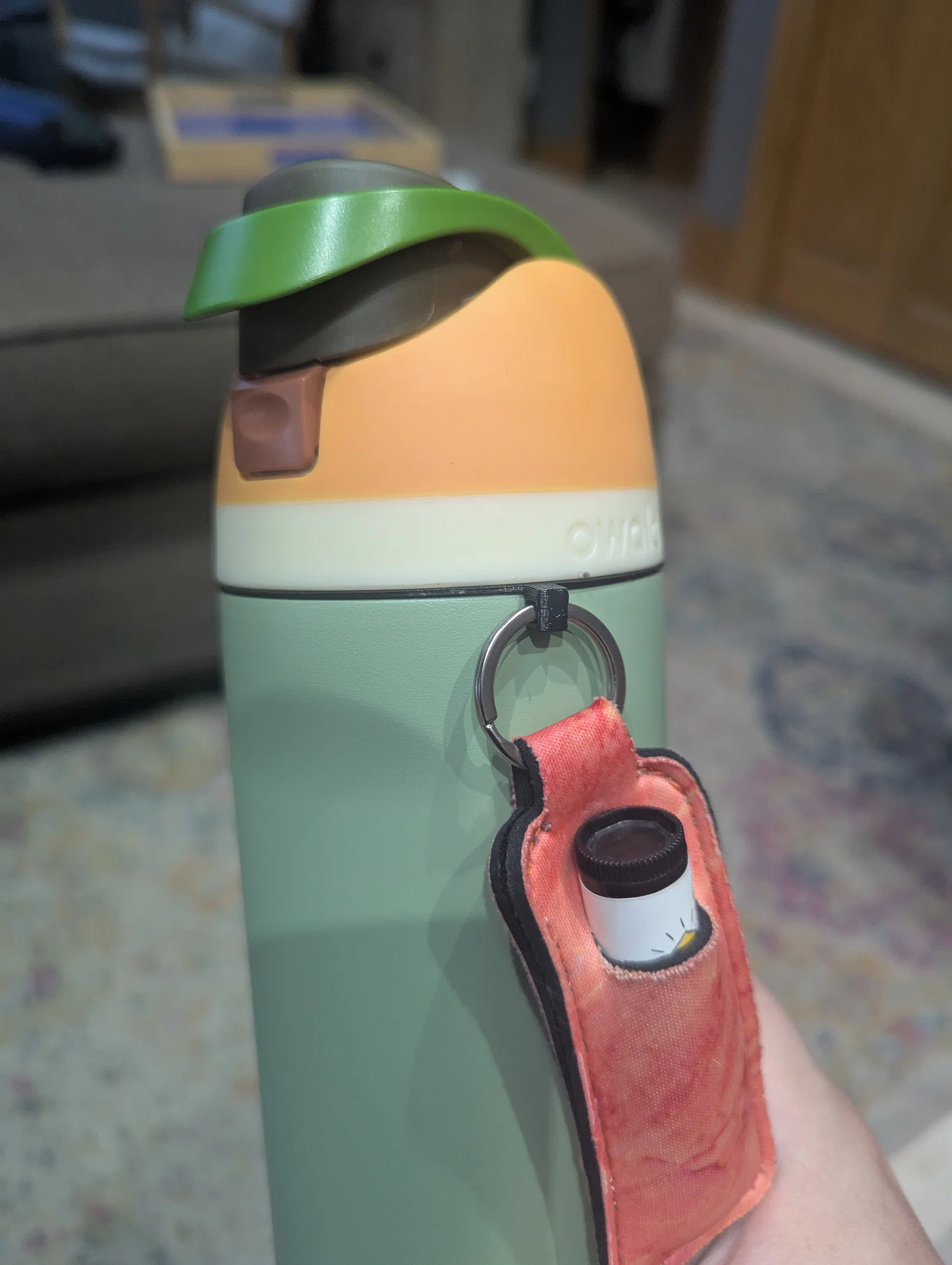 Vợ mình không thích việc bình nước Owala mới không có chỗ để móc túi đựng son dưỡng như bình cũ của cô ấy. Mình đã in cái này bằng nhựa TPU, lớp đệm mỏng giúp nắp vẫn vặn vào bình bình thường mà lại tạo thêm một điểm để treo móc khóa cực tiện lợi.